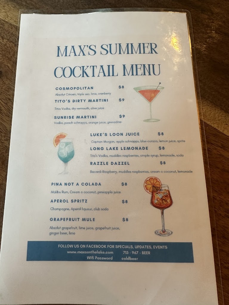 Max’s on the Lake is located on Lower Long Lake near New Auburn. We are in northern Chippewa County known as the Blue Diamond area. Legend states that when flying over our area, airline pilots see a multitude of sun glistening off the abundance of lakes, reminding them of an actual blue diamond. Open 7 days a week in the summer and 4 days a week in the fall, winter, spring. Max’s is committed to providing exceptional customer service, hot made to order food menu items, delicious local craft beer, and unique cocktails. Right on Highway 40 we invite you to the lake and hope to see you soon!