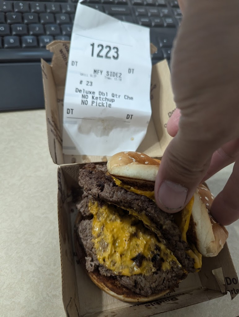 I went through the drive through, ordered a small coffee and a McChicken. I pull up to the window and the lady asks me if I ordered the small coffee and a McChicken, and I said yes, she handed me the coffee and the bag. I go home and open the bag, I got a hamburger. Cool…. Thanks Abbotsford McDonalds.