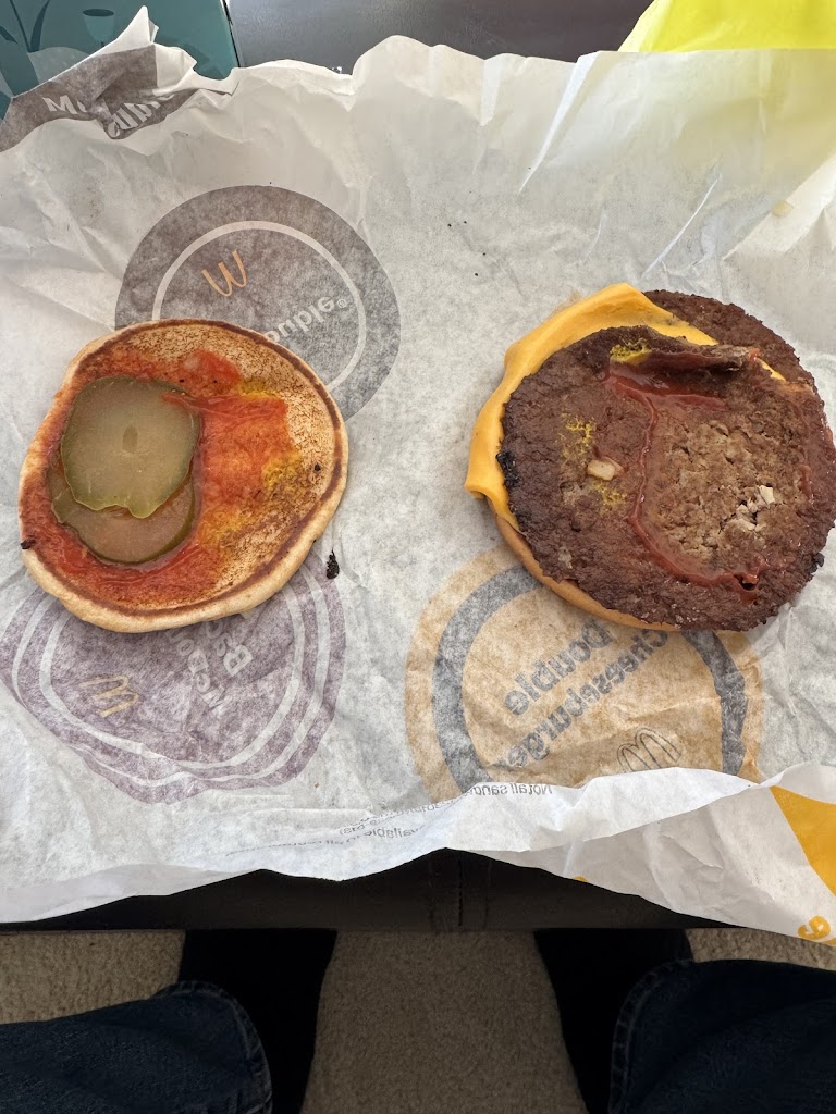 I went here after work and got a big mac and a quarter pounder with cheese. I got all the way home and went to eat with my girlfriend only to realize that there is no big mac at all, and the quarter pounder was hard and black and burnt. So i brought it back and nicely told them about what happened, and they gave me a new bag of food l, so i went home and opened the bag and there was a big mac that looked good, but then i open the quarter pounder and see that its literally burnt black again. This isnt the first time or the second time ive had problems with this McDonald's either. My last problem i had with them i made a pickup order online and paid for it and it was pouring rain out and i was at my buddies down the road and i got there about 15 minutes after i placed the order and they said they had thrown it away already and that they couldnt refund me and to try to come back the next day to solve it, their reason they threw it away was because it was 4 minutes after breakfast was done and said we took to long and so we tried to come back there atleast 15 times and get our money refunded but each timr they had a reason why they couldn't do it or about half the times we tried to get it resolved they said we would have to wait and eventually it will get refunded and that was a 30$ order that never did end up getting refunded. If you look in the picture you can see how awful that quarter pounder looks, and how they just threw three pickles almost on top of each other and then the other pickle is on the other side at least, but this just looks nasty and dry and just as bad as the first one that I got if not worse. I went to pick it up and look at the other side and it was so dry and old that it literally just broke apart. But when I had called the lady working, a short skinny woman who usually works night shift, she told me that it was freshly made and that it's too late to get a new one now because they're cleaning up for the night. How hard would it have been to just make me a new quarter pounder when they literally closed about 5 minutes before I called. She then rancid on telling me that I should not accuse her of giving out the same quarter pounder because that is just nasty... But really what's nasty is the food that I just paid for and wasted two trips going back to the store to get our order right. Highly don't recommend going to the store, and if you do, make sure that you check and see if everything is there and not only that open up the wrapping or box and make sure it doesn't look like it's been sitting there for hours all nasty and dry.