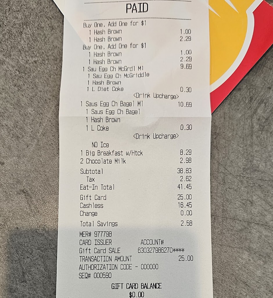 You know the receipt you get after you purchase food and on it you get a survey to do once completed you get a code number to get a buy one get one free Any sandwich, will they didn't honor it and said i could only get a chicken sandwich or mcdouble, but I wanted a fish they said no, I felt that was very wrong and the Manger look like oh well, Not coming here again why give a receipt that states Any sandwich and not honor it how do you think a person will feel about that?