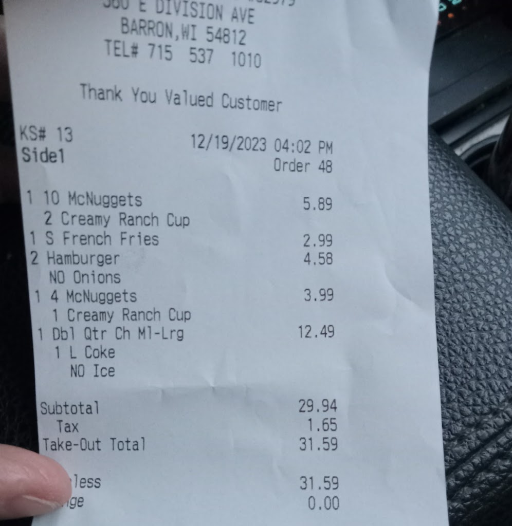 I don't normally come to Wisconsin.. but when I do and I'm ready to leave home to Minnesota from Rock Fest.. I stop at McDonald's for a quick lunch. I would give a zero review if I had that option. I ordered a 2c meal which was a Deluxe Quarter Pounder but asked for no onion and extra pickles. Then my boyfriend got 2a which is a regular Quarter Pounder but he added bacon. We went through the drive through a second time after finding the food was wrong, because the front door was locked since lobby was closed.. at 11:37am; In our bag was the wrong order.. we got a Crispy Chicken add bacon, and a regular Quarter Pounder. After talking with staff and a manager then checking the receipt, we noticed the receipt was wrong so the person who took our order put it in wrong or heard us wrong. Then we checked our food again and we had to go through the drive through a third time because they gave us a Deluxe with no pickles and no onions.. and a regular quarter pounder with no bacon. I asked for them to just hand me pickles and bacon since that's all I was missing this time and we'll leave. The only good thing about Wisconsin is cheese and Rock Fest... I have worked at McD's and been to many McD's but this one was the worst.. hopefully it's not because of Wisconsin because Minnesota McD's aren't that bad. Anyway.. thanks for trying..