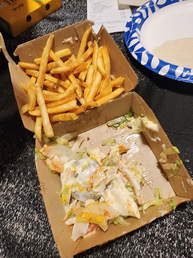 So, my experience was not thw best tonight, I'm not aure if it's lack of employees are what but yall news to do better. . Get home to eat, Fries were hot and hard yuck. . Everything came off my sandwich while i was eating it, maybw i should have just gotten a hamburger. . Maybe if yall lightened up on the mayo you could afford new grease for the fryers. . .