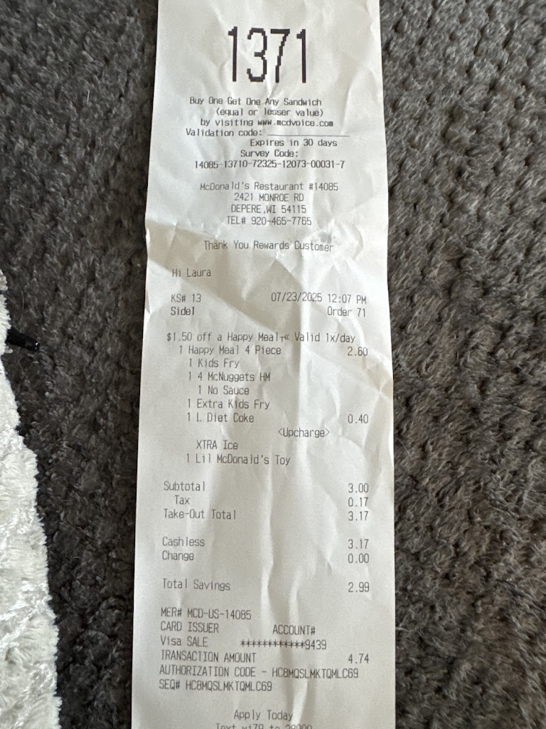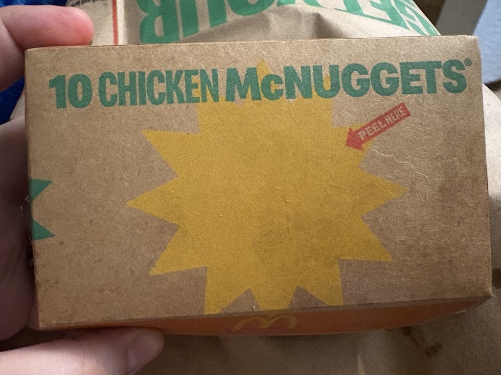 Drive thru took a while, then part of my order was forgotten and I had to ask for it. Once I went to eat it I saw that I was only given 3 McNuggets in my 4 piece