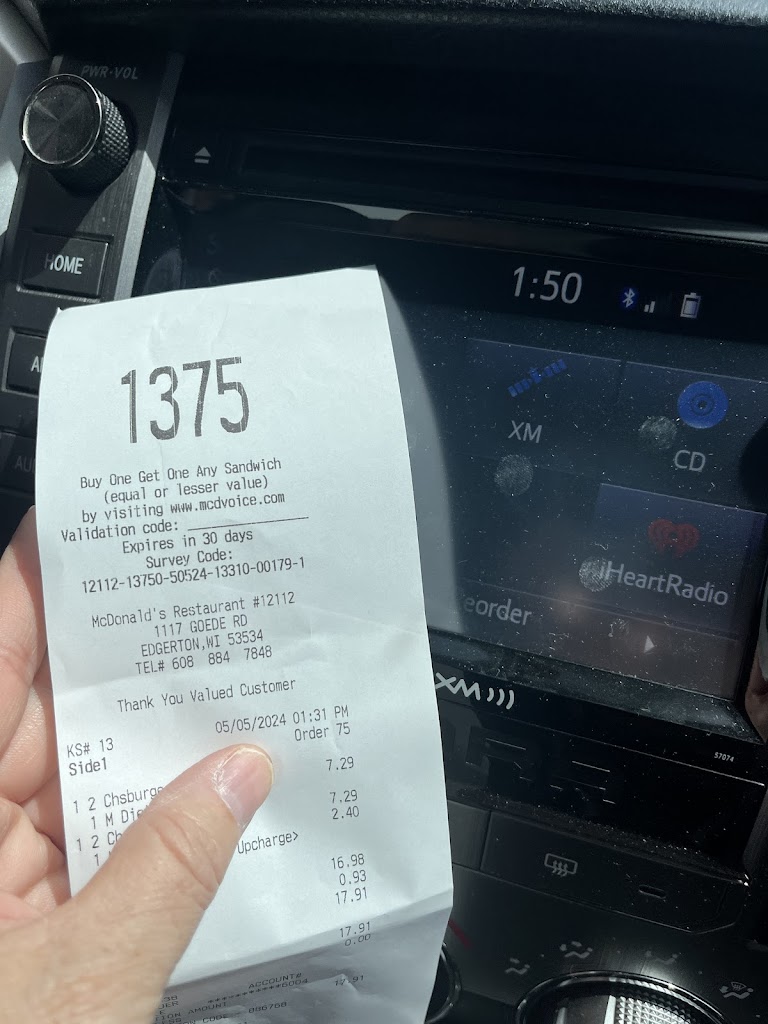 5 minutes later I get my fries and burger - the burger isn't right, so I say "I asked for plain". Im told "you didn't tell me that" and I said "yes I did and its on the recipe". Closes the window and then comes back to say "I told them 3x it was plain"... show my receipt to prove i said, plain.. she takes the wrong burger back and 7 minutes later comes back with the correct burger.