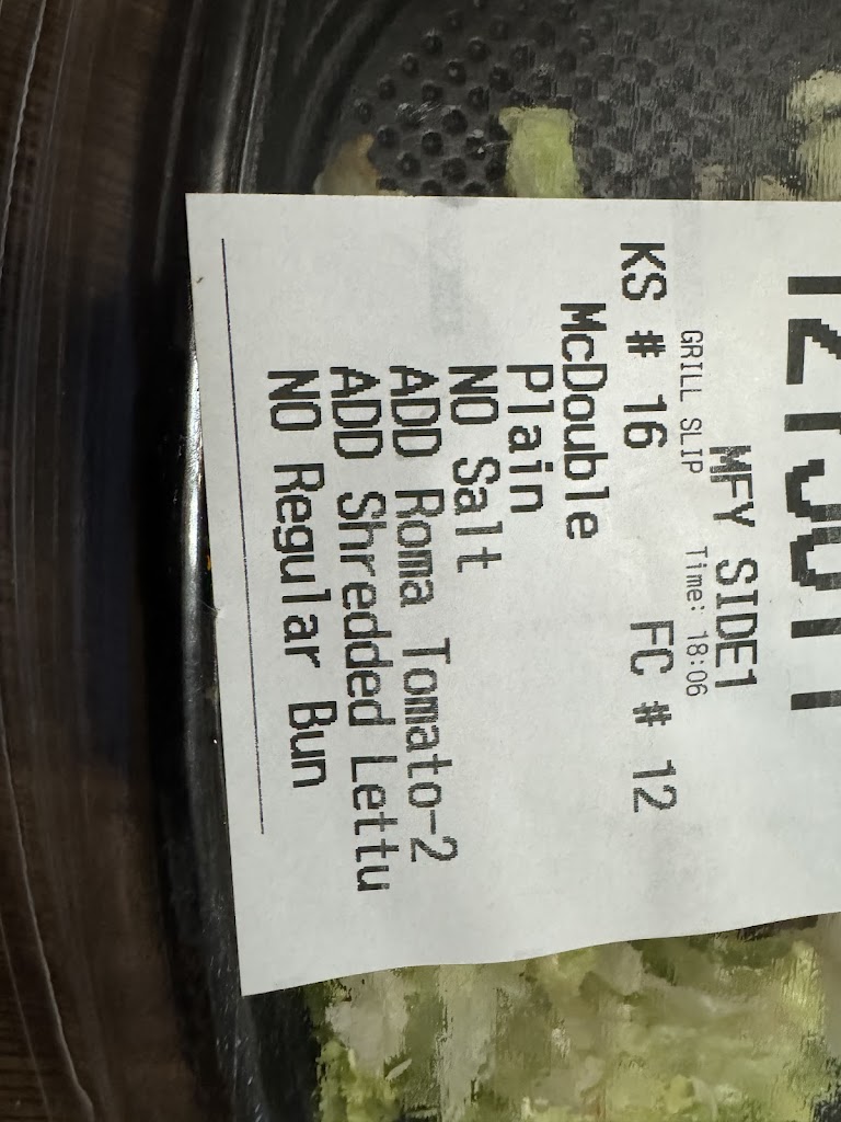 I ordered a McDouble Meal and I got this. This isn't a McDouble this is a salad. Cashier didn't even know how to print a receipt. 0/10