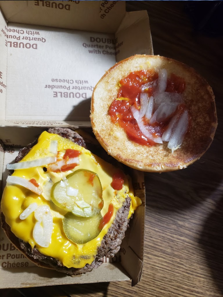 I asked for a large fries and my fries were only filled halfway. And my double cheeseburger was messy, a little too much ketchup. My girlfriendβs medium fries were also filled halfway, it was more like a small fries even though we paid and asked for a medium fries.