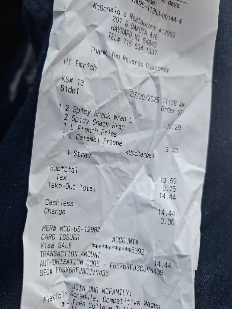 Meal: It's a scam. A burger should not be 2.50$ it's way overpriced garbage you get less of it and paying more compared to back then when we used to have a DOLLAR MENU. You're lucky to get some sort of deal from the app. And it's very limited as to what you can get a deal from. A meal pushing 10$ USD for what is barely a big mac compared to back then is abysmal. Really you can pay slightly more at an actual restaurant and get quality food + fries and drink elsewhere.