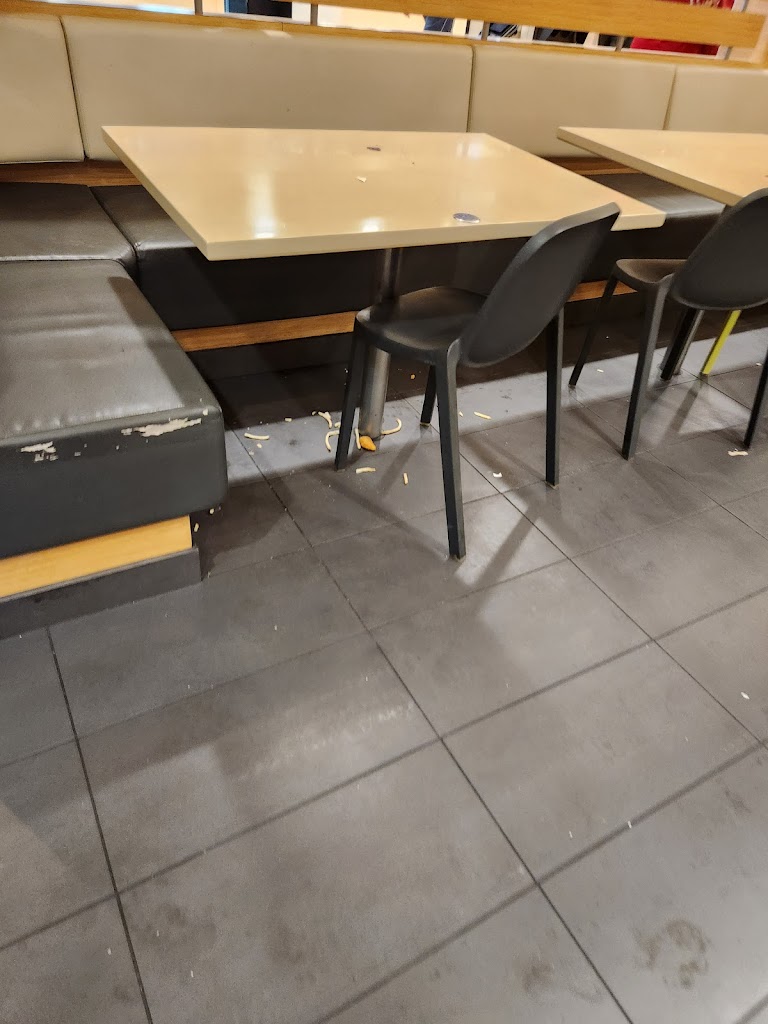 Stopped at around 8:15pm on a Saturday, dining inside with 4 people. Took a few moments for any of the employees to even acknowledge we were there, everyone seemed only to care about the drive thru. Once we ordered, it took much longer than it should have to get our food. The store was not any busier than what I would say is normal Mcdonald's traffic. In addition to slow service, the store was a disaster. My shoes stuck to the floor after standing by the drink area, the drink station was a mess, floors were filthy and garbage was strewn about. It very much appeared like none of the employees wanted to move too quickly or work too hard. The store itself was modern and updated nicely, just poor service.