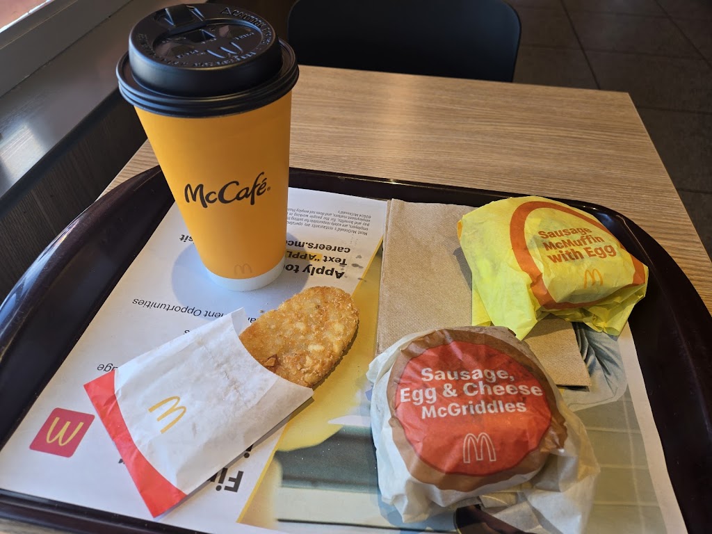 Before getting on Hwy. 41, I have stopped at this McDonald's for breakfast many times (It's attached to a gas station). The staff is friendly, and they have hustle. I get the sausage, egg and cheese McGriddles meal and a sausage, egg and cheese McMuffin side sandwich. Also, I upgrade the coffee to large, so I can watch for deer while winding my way further North.