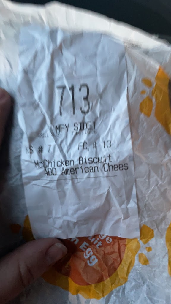 I ordered a mcchicken biscuit add cheese with my breakfast. I waited around 10 minutes for my order for the chicken to be cooked. I paid almost a dollar for a slice of cheese and they didn’t even put it on my sandwich. They must have made my other sandwich a lot sooner too. It was warm. Not hot. As if it sat waiting for the other one. But the paying for something I didn’t get is what really irritates me.