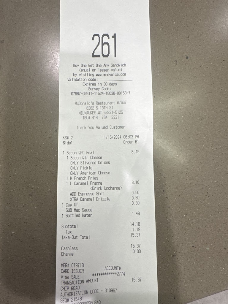 I ordered one cheeseburger with no mustard and extra pickles earlier today, along with two fries and a drink. The cheeseburger was made perfectly to order, probably the best cheeseburger I’ve had from McDonald’s in a while. The workers were also very nice.