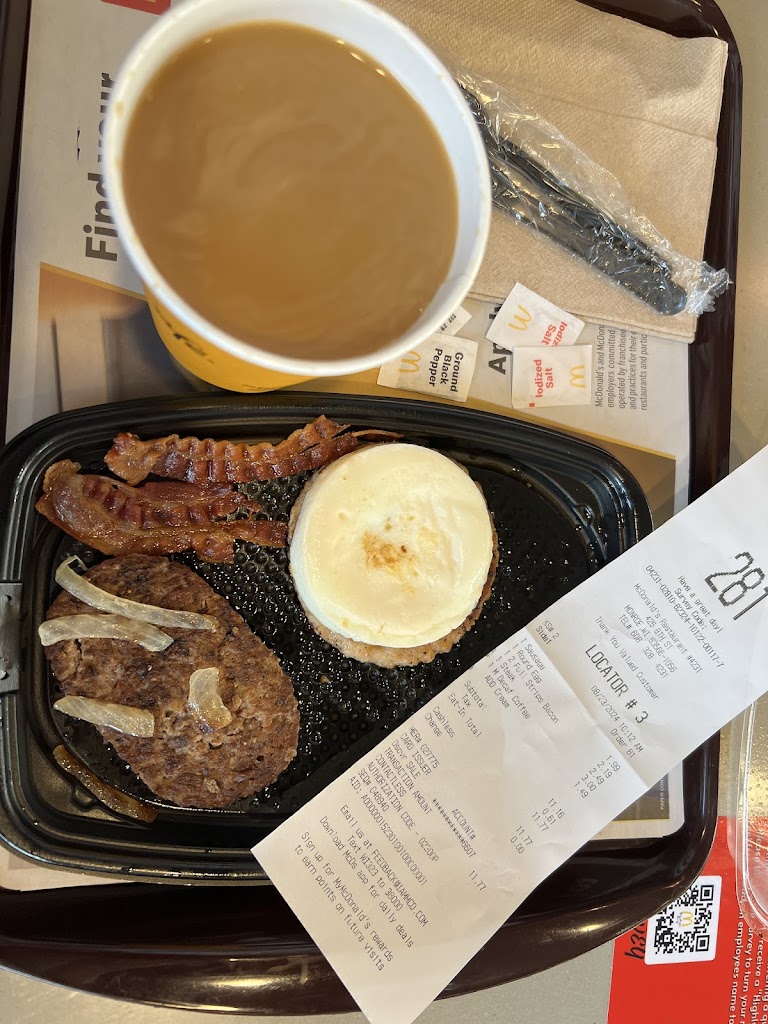 Ordered a biscuit with egg and bacon. No bacon no cheese. Where's the double check before the sandwich is wrapped? 11/10/23 update - gave me the wrong order. Fod was good and hot but I didn't order the McNuggets or the Large fries 🍟. I could see the window operator did not even look into the bag before giving the order to me.