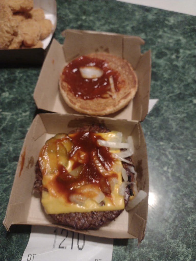 I ordered a plain cheeseburger. They asked me 3 times to repeat it. Then they asked me at the pay window if it was a plain cheeseburger with nothing else on it and I said correct. When I opened it down the highway it had ketchup on it, lots of ketchup. The order receipt printout attached to it said Amer cheese only. Maybe the order filler needs to be re-trained?