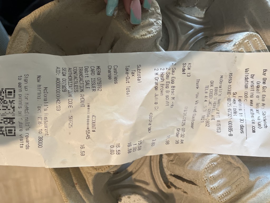 I was overcharged. I ordered 2 numbers 4’s and asked for orange juice as the drink. The screen showed the total as $11.98. She said the total was $16.58. I asked where did the extra $3.60 come from. The manager stated that orange juice was considered a specialty drink and that the meals only come with a fountain drink. Who gets a soda with breakfast? The options are usually orange juice and milk. After tasting the food I was even more upset because the biscuits were hard and the hash browns weren’t salted at all. I threw it away. Waste of money. Would not recommend this location.