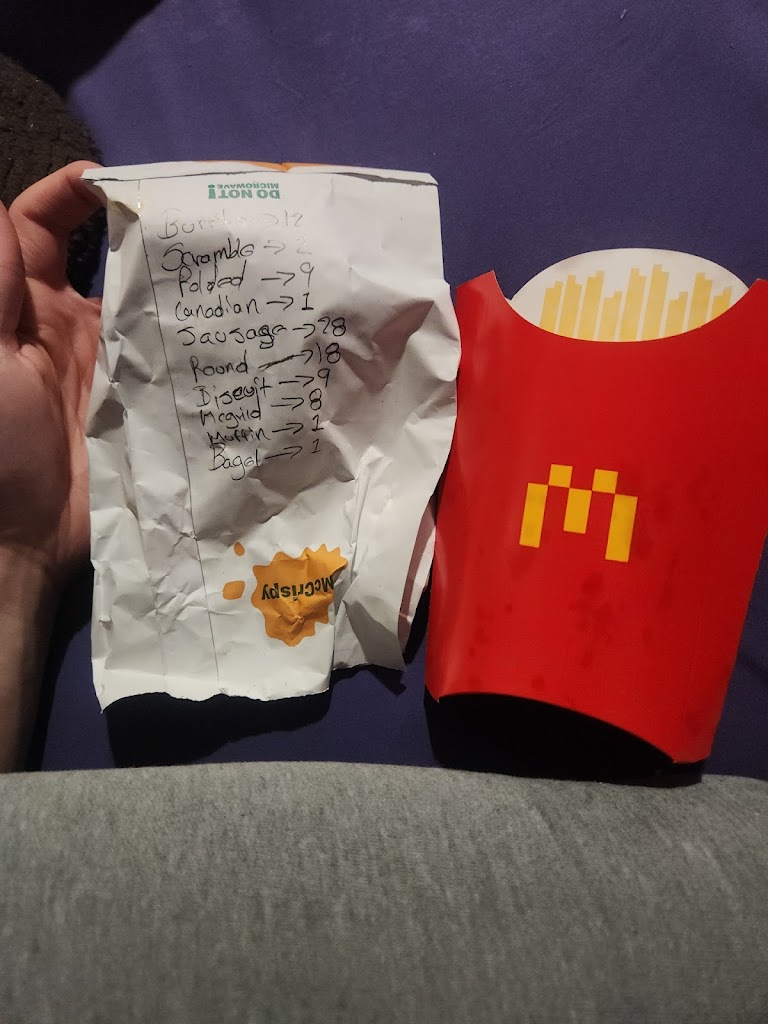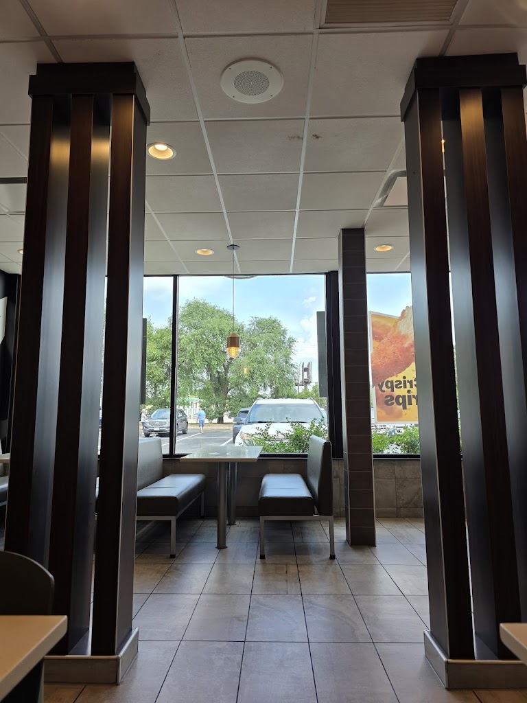 This was a curbside order. Typical MCD's food. The girl that brought my order out was a grumpy gus. It was raining lightly, and she didn't move very fast for being a young girl. I'm sure she did get a little wet. Sorry girl. Maybe McD's isn't the place for you... I think that curbside delivery is in your job description and I was in spot #1. Not far to walk. I use curbside because I don't want rain down the inside of my car door. We all have parts of are jobs that are less pleasant than others.