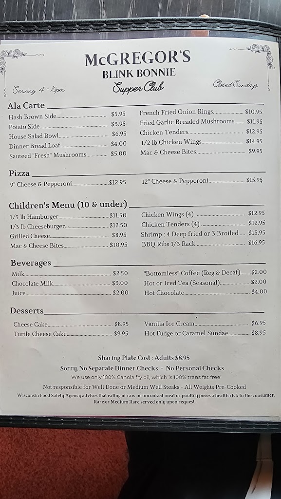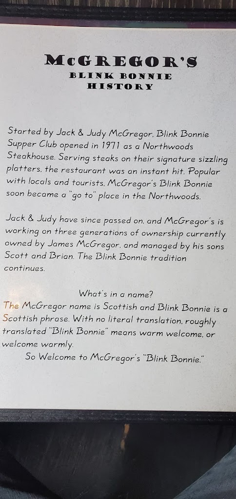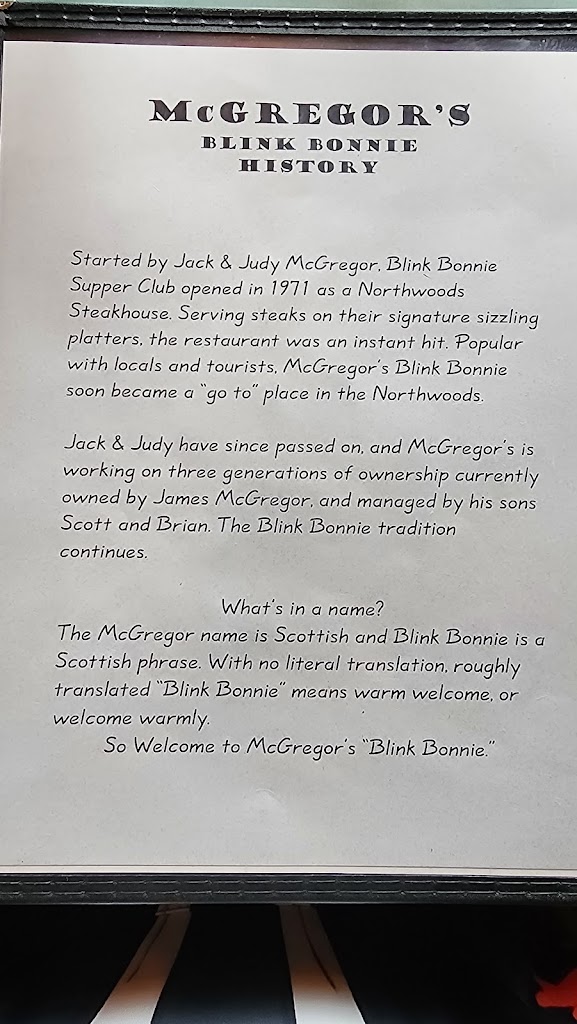 Awesome filet mignon, hash browns, salad, bread and SoCo Old-fashioned. The filet was cooked to perfection... very tender and tasty. We were lucky to have only a short wait. I highly recommend McGregor's Blink Bonnie. I have been going here for 50+ years and they never disappoints me.