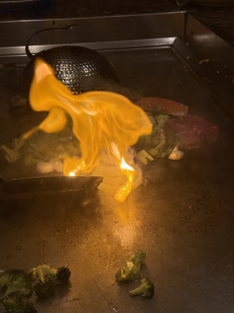 However, there was one major issue that unfortunately left us feeling uneasy. On three separate occasions—once at our own table, once at a neighboring table, and once across the room—we observed chefs using the same knife and spatula to handle both raw meat and cooked vegetables without cleaning them in between. In our case, our chef cut raw chicken, then used the same utensils to cut broccoli and flip it into guests’ mouths. The same practice was repeated by two other chefs at different tables.
