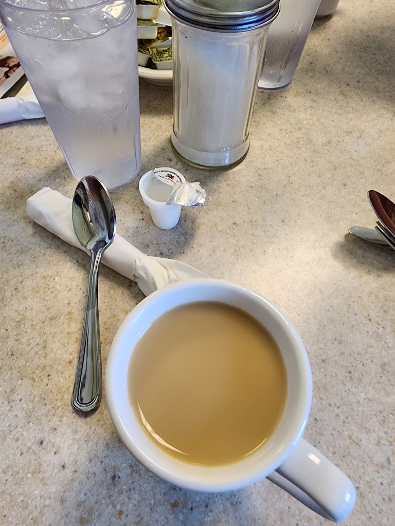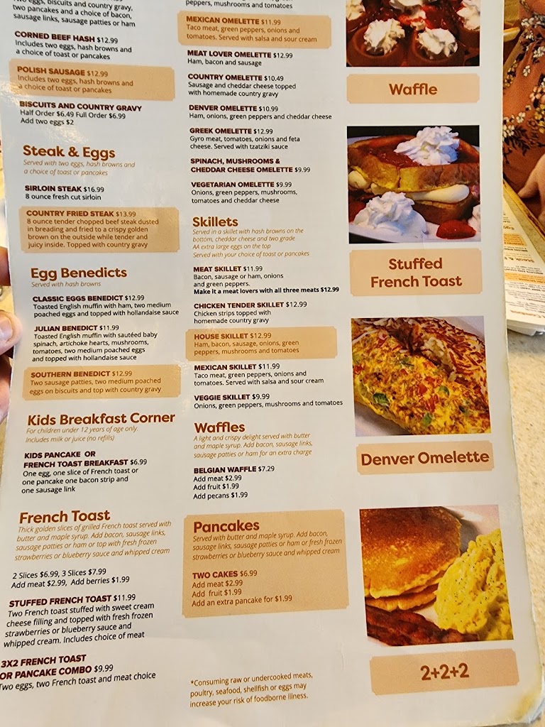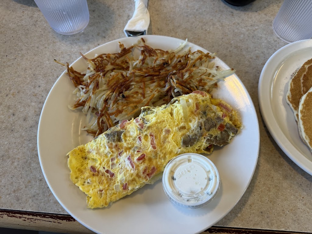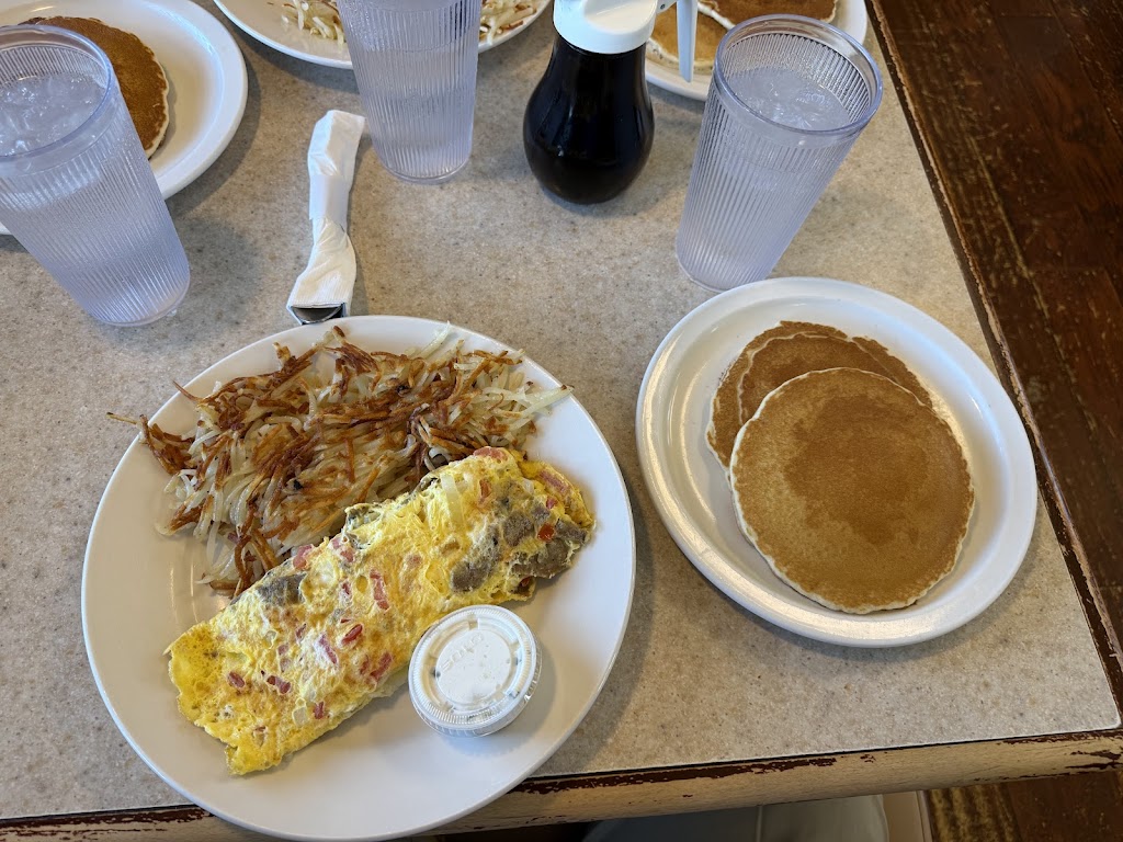 Great flavor in my omelette. Onions, peppers, hash browns, sausage. Pancakes too All washed down with coffee. Waitress was really caring. My mom ordered soup, and the waitress brought her soup early because she was afraid they were running out 🙂 very nice