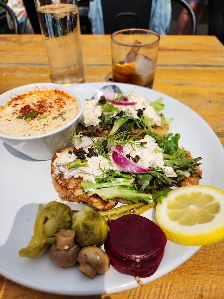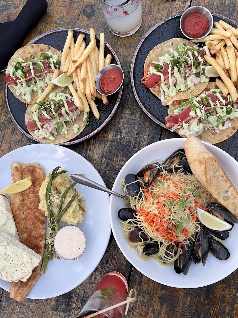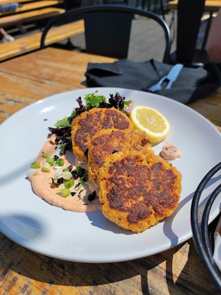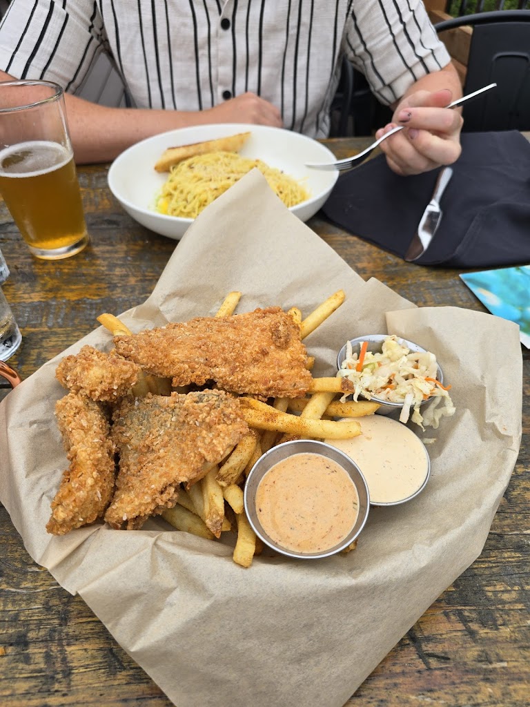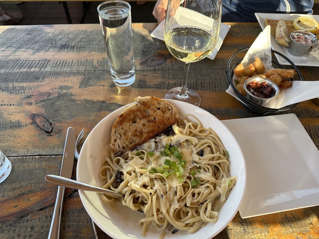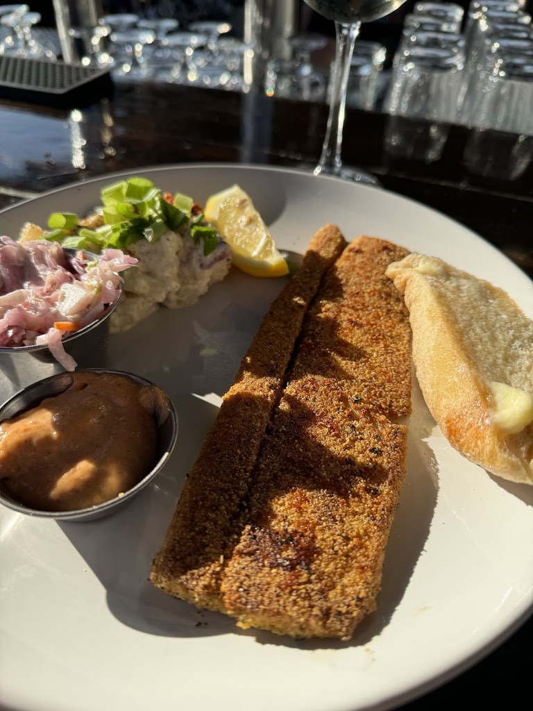 It was a cold windy day, so we ate inside. I had the whitefish sandwich, and it might have been the best fish sandwich I have ever had. Lightly breaded, and really nice garlicky aioli. Can’t speak about much else menu-wise. The service was adequate, and the (inside) atmosphere was loud. But I would go back for that sandwich in a minute.
