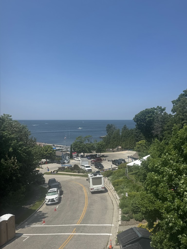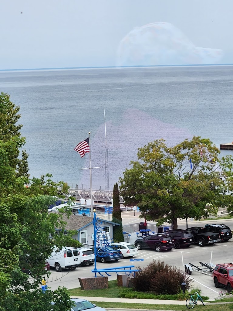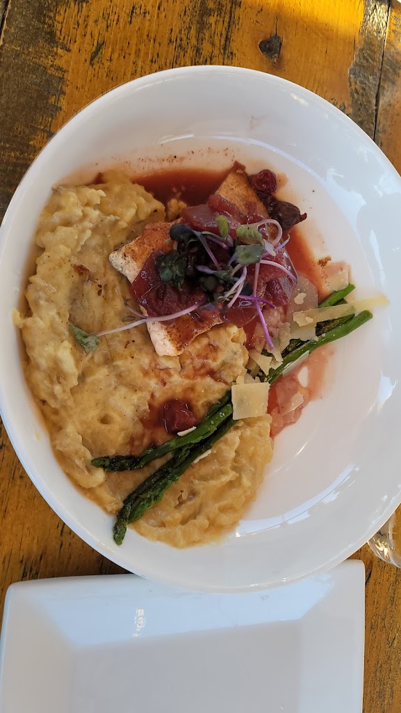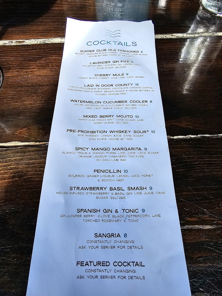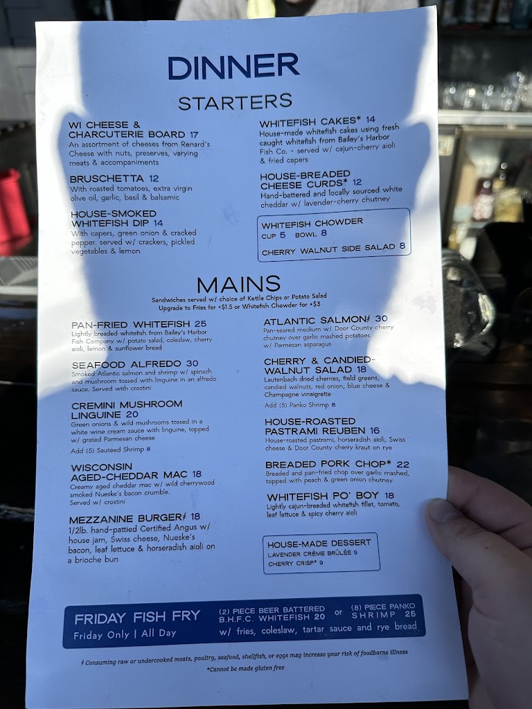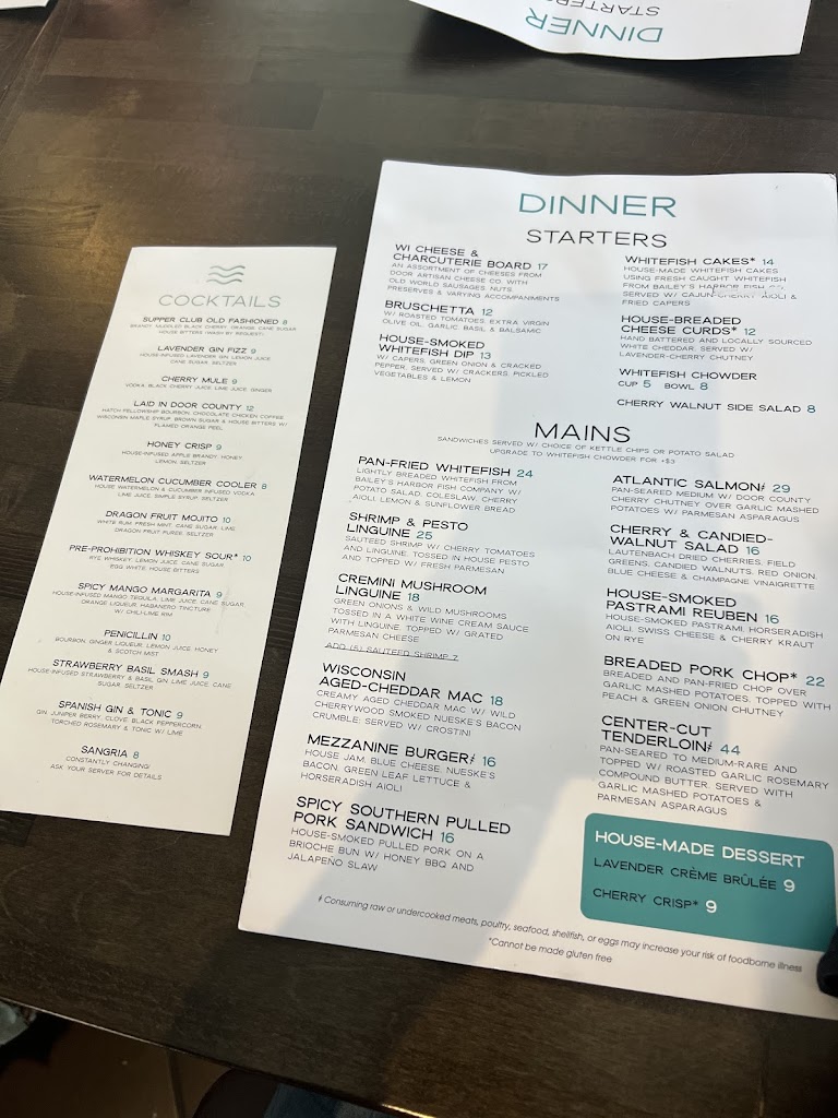 We came up to door County for our anniversary in May just before season. We came to the mezzanine around 5:30 for dinner. It was moderately busy very trendy. Quite loud. If you have hearing issues, it’s hard to hear. The view was incredible, of the harbor and the lake. There is a rooftop bar that looks fun when open. And a candy shop that was full of candy but closed. They have a full craft cocktail menu, which looks delicious. I ordered a Mojito which was delicious, and my husband ordered a vodka, tonic. We order pan seared white fish which comes with potato salad and coleslaw. My husband asked if he could substitute for the potato salad. Our waiter said sure you can have potato chips so he did. I asked if I could substitute chips for the coleslaw. Our waiter said,”no, that wouldn’t be a fair trade”. I didn’t realize we were trading something! I didn’t want the coleslaw. He said,”I can take it off for you”. Is that a fair trade? He didn’t even make any suggestions.