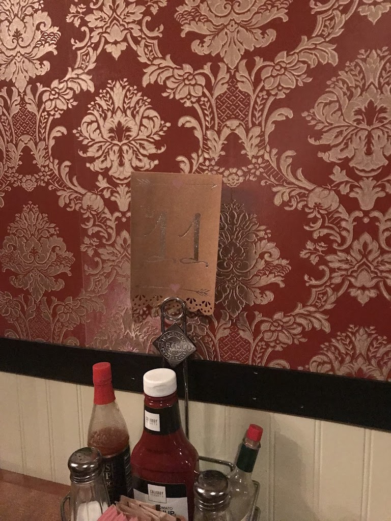 A second room alongside the barroom is lined with red upholstered booths and embossed red and gold wallpaper. It is underused but has great dining potential. We were made welcome to take our drinks there and wile away the afternoon playing rummy. We'll definitely do that again.