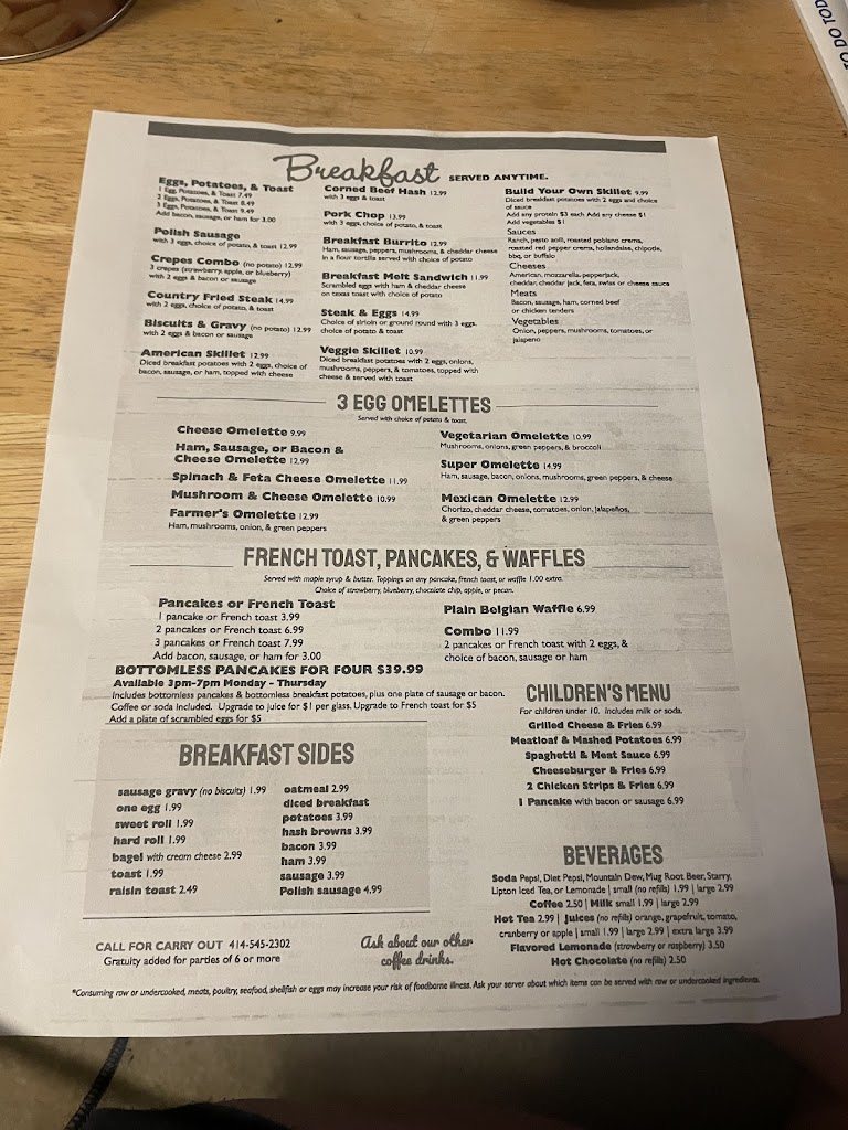 Was a good old fashion greasy spoon. Good food, good prices, wait staff very attentive.