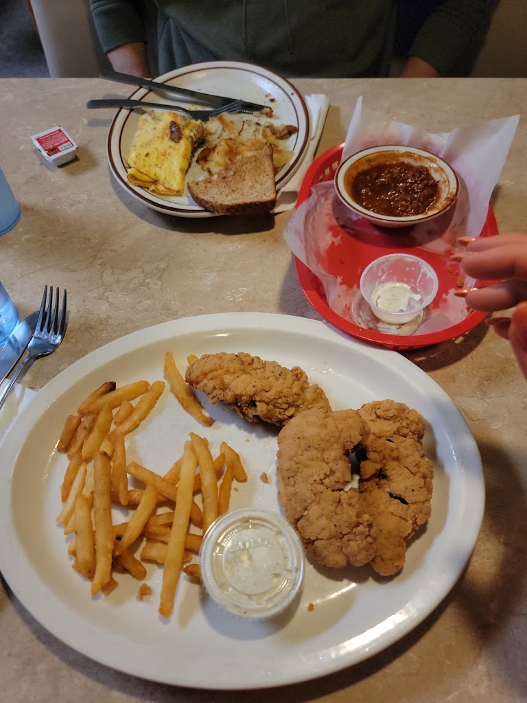Small mom and pop type feel, I did carry out but wouldn't mind going back for a sit down meal. Customers looked to be local regulars, there was maybe a dozen to 18 booths? And counter seats. Angled parking out front with street parking right behind. We got a quart of the chicken dumpling and a liver and onion with bacon dinner, everything tasted great, the order was correct, liver was properly done, with 3 big pieces of bacon. Bread was included with the soup. Over all a very nice experience, we will definitely be back to try more dishes!