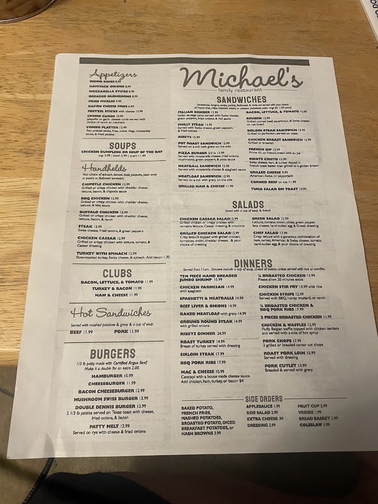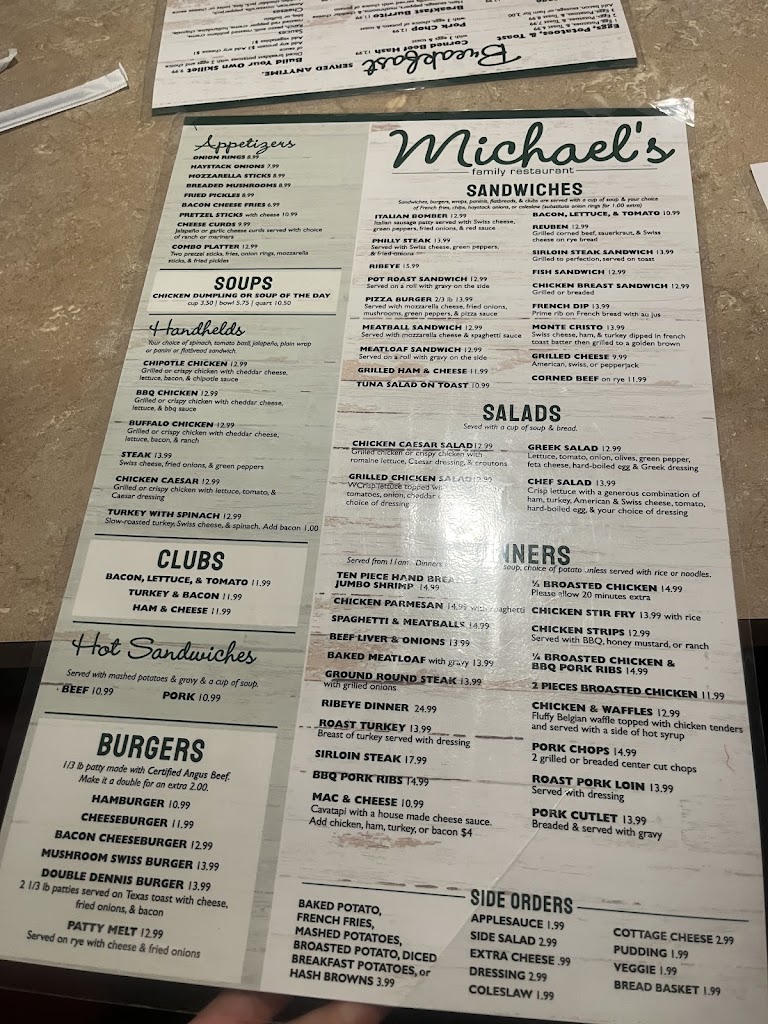 Michael’s has some of the best food in the area. They have some excellent “comfort food” as well. I particularly like the fact that the senior menu starts at age 55 (and I’m 58). I don’t understand why this place isn’t more crowded, but selfishly, I like that I can always get a table no matter the time or day. Lexi and Jadyn are amazing. They literally run the place with zero stress and they’re always smiling.