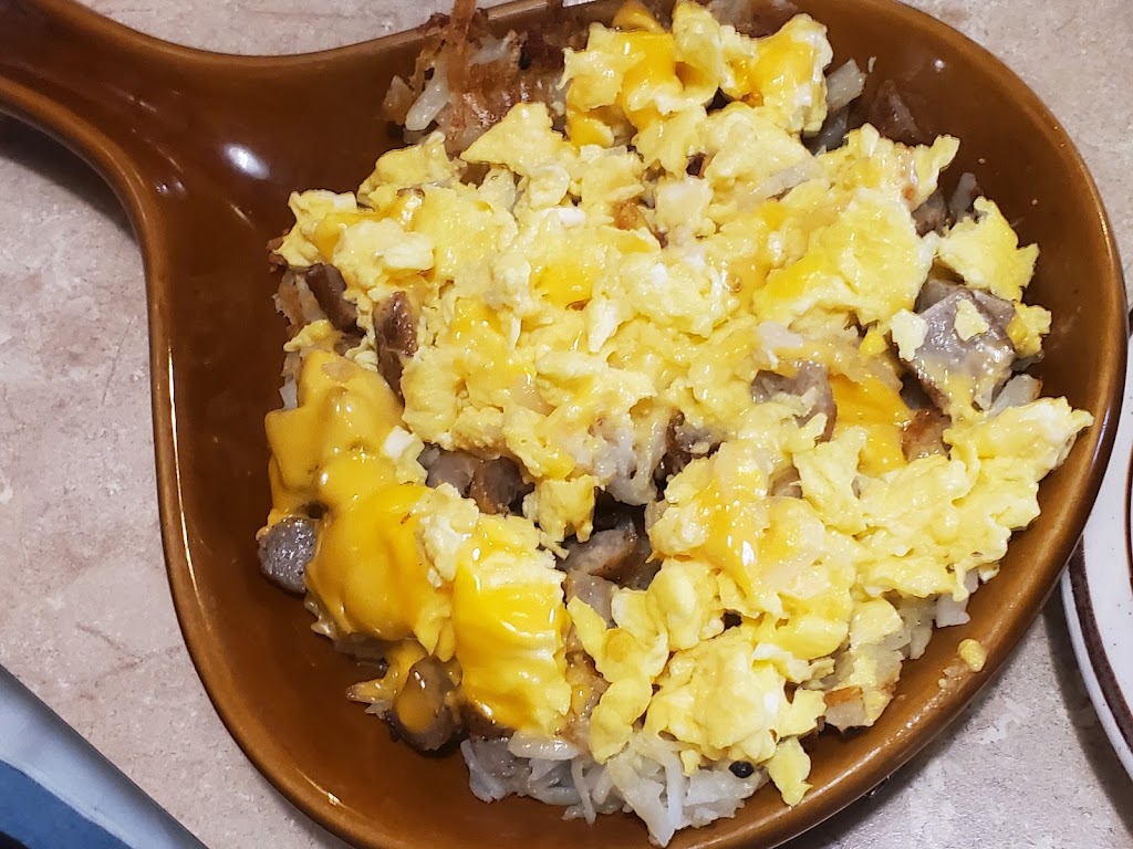 Pre-made nasty hashbrowns and scorched coffee. Great Omlete.