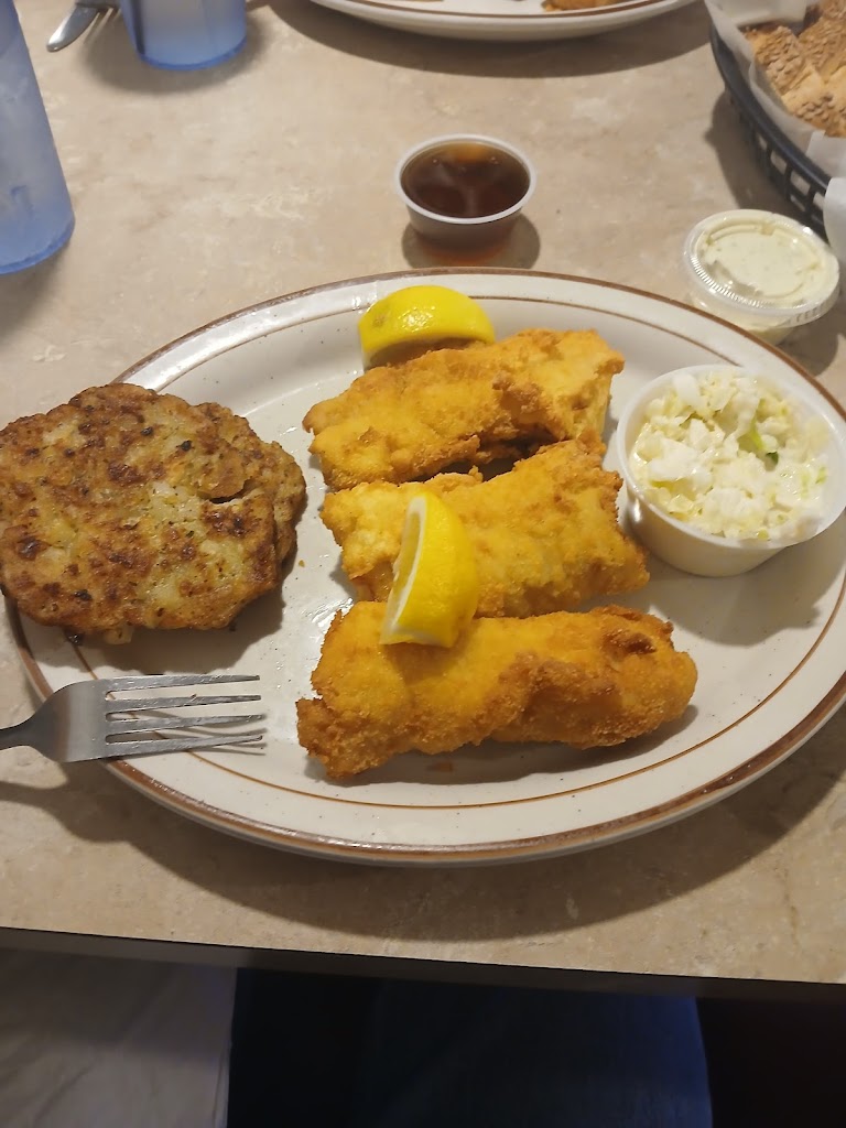 Stopped for a fish fry , we have done this many times before . This time the waitresses were not friendly, gave us bread basket 3 super thin slices of bread . I asked for more bread got a dirty look, she bought them but really. We got our food ,waitress never came back to ask if everything was ok , never gave me more water I was bone dry. The food we'll .. it has been better, the fish was overcooked, cole slaw was warm small amt of fries potatoe pancakes were ok . The chicken dumpling soup no real flavor and the clam chowder was on the watery side . It has changed and not for the good . Will go elsewhere for fish fry.