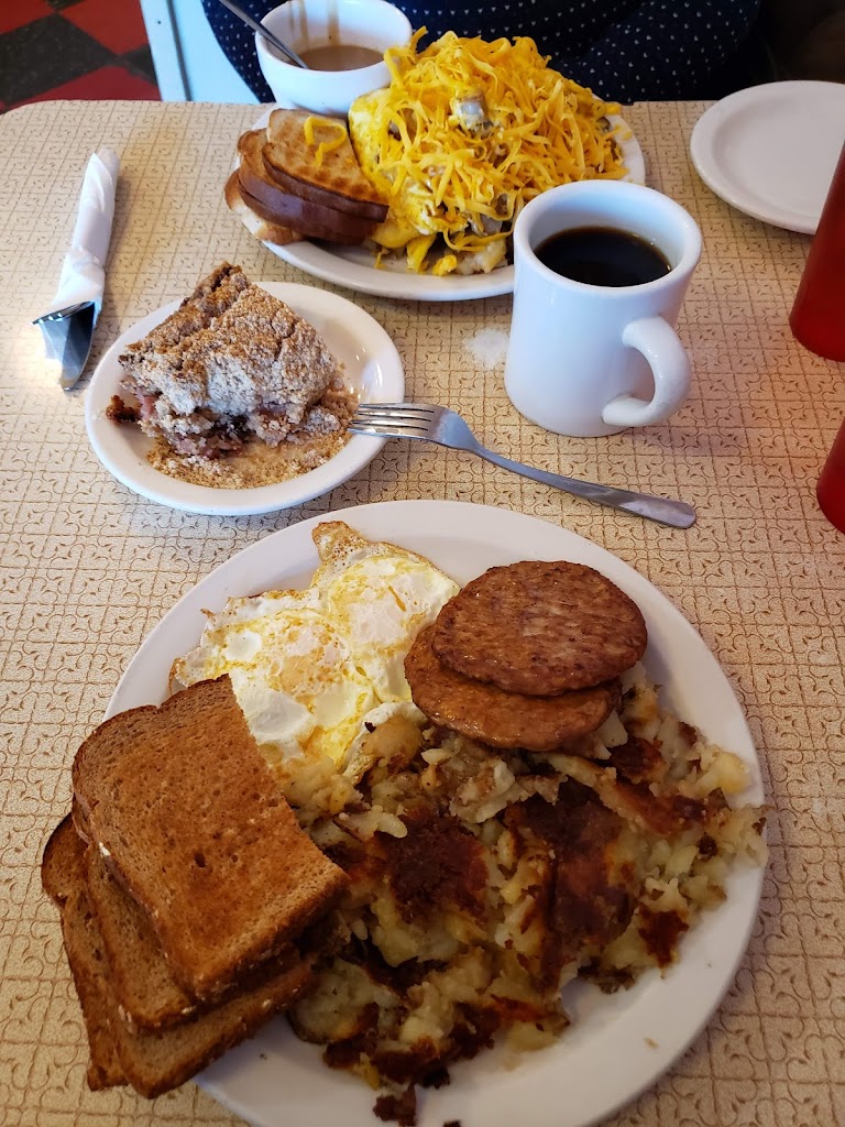 BIG breakfasts in a nostalgic setting. Great prices. The coffee cakes are fabulous especially if they are still warm from the oven. Try the yanks with onions for a savory breakfast.