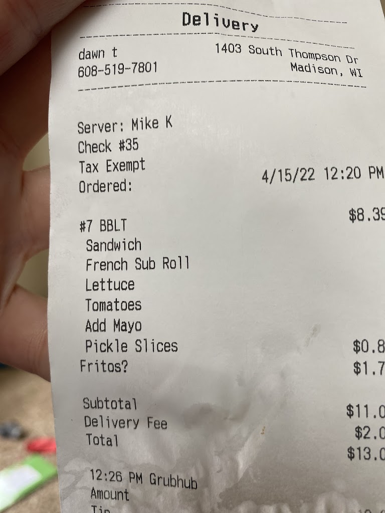 I ordered through grub hub and what I ordered on grub hub was not at all what I got. The receipts don’t even match. My sandwich was made wrong, and my soda was missing. I called the store and I can get a free soda next time but nothing about the sandwich being made wrong. I don’t understand why the printed receipt didn’t match the grub hub receipt. You need to work on training with the grub hub app or stop using it.