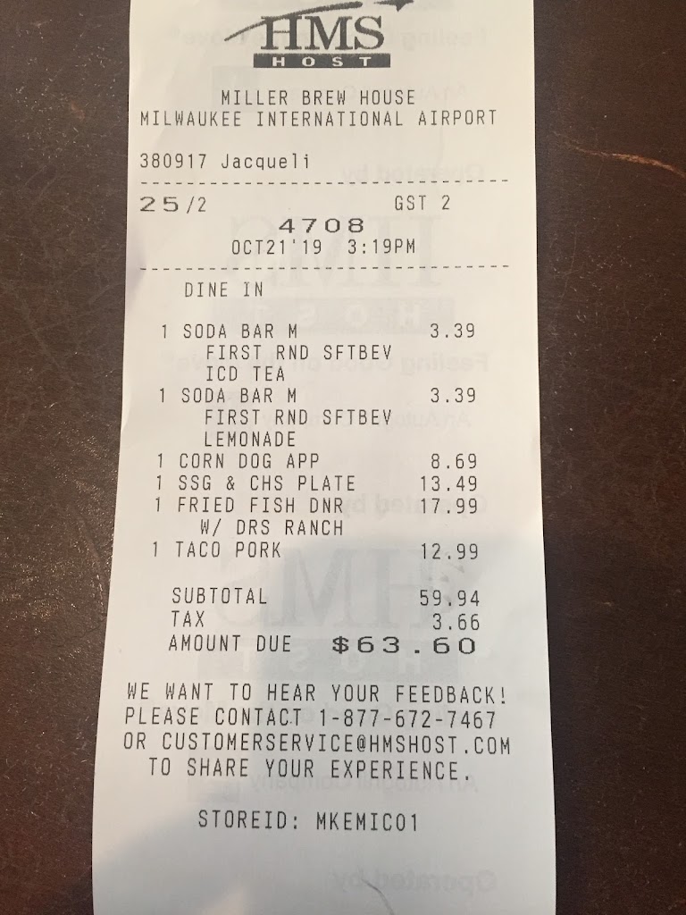 Staff failed to show up. 1 bartender and 1 cook for the whole restaurant. Bartender shut down food orders cause he couldn’t do it all by himself. Food was burnt, and it was only cheese curds. Then HMS Host charged me a 4% fee because they are not making enough money, which was added to my bill. This was posted on the paper menus, but not on the online menus they force you to use since they don’t have staff. Do not eat at HMS run restaurants at MKE!