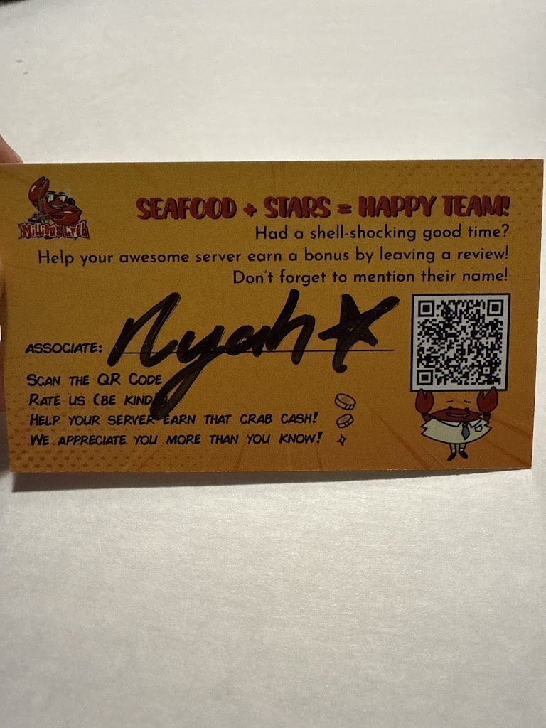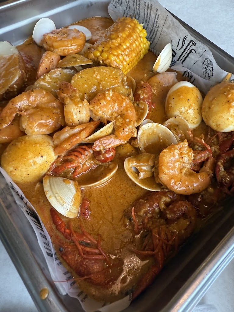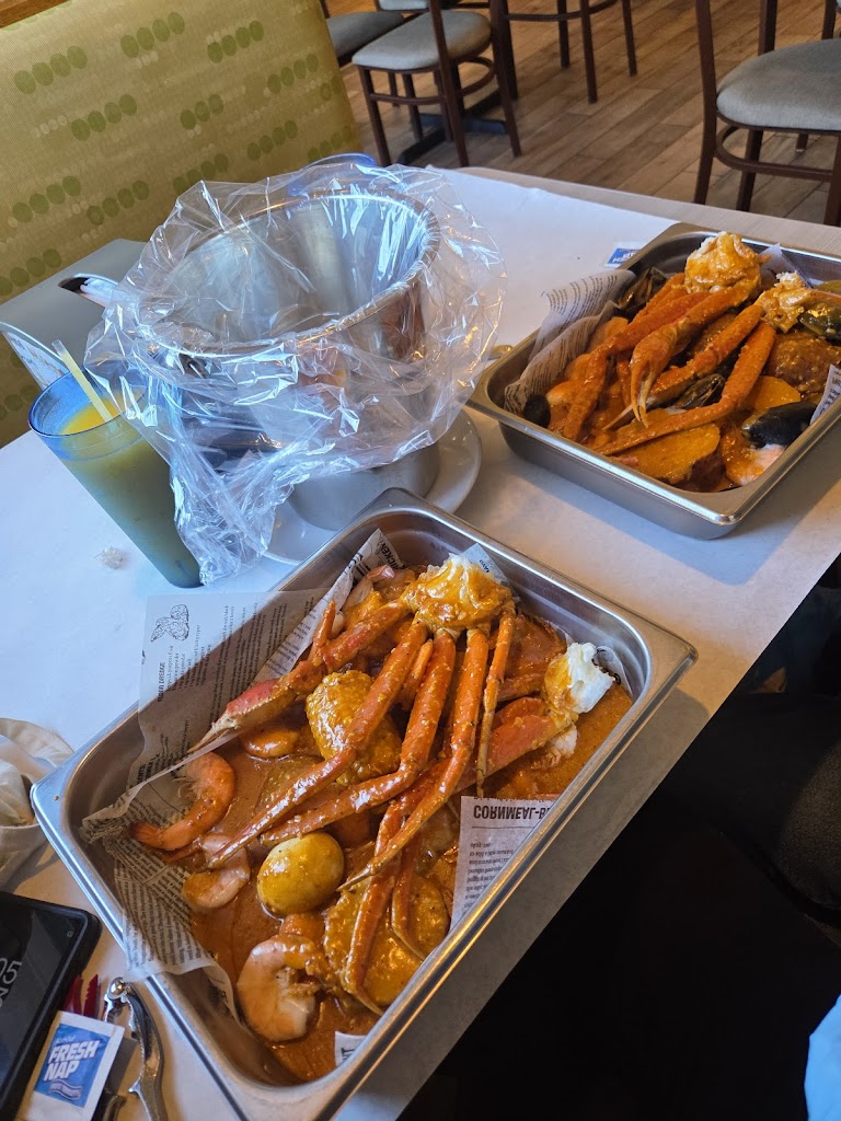 Eliana didn’t just bring our food — she delivered it like she was unveiling the Mona Lisa of seafood. The boil came out steaming, seasoned to perfection, and presented with the kind of flair that made me wonder if I should stand up and applaud. She made sure we had gloves, bibs, extra napkins — basically everything short of a hazmat suit (which, frankly, might be necessary for how hard we went at that crab).