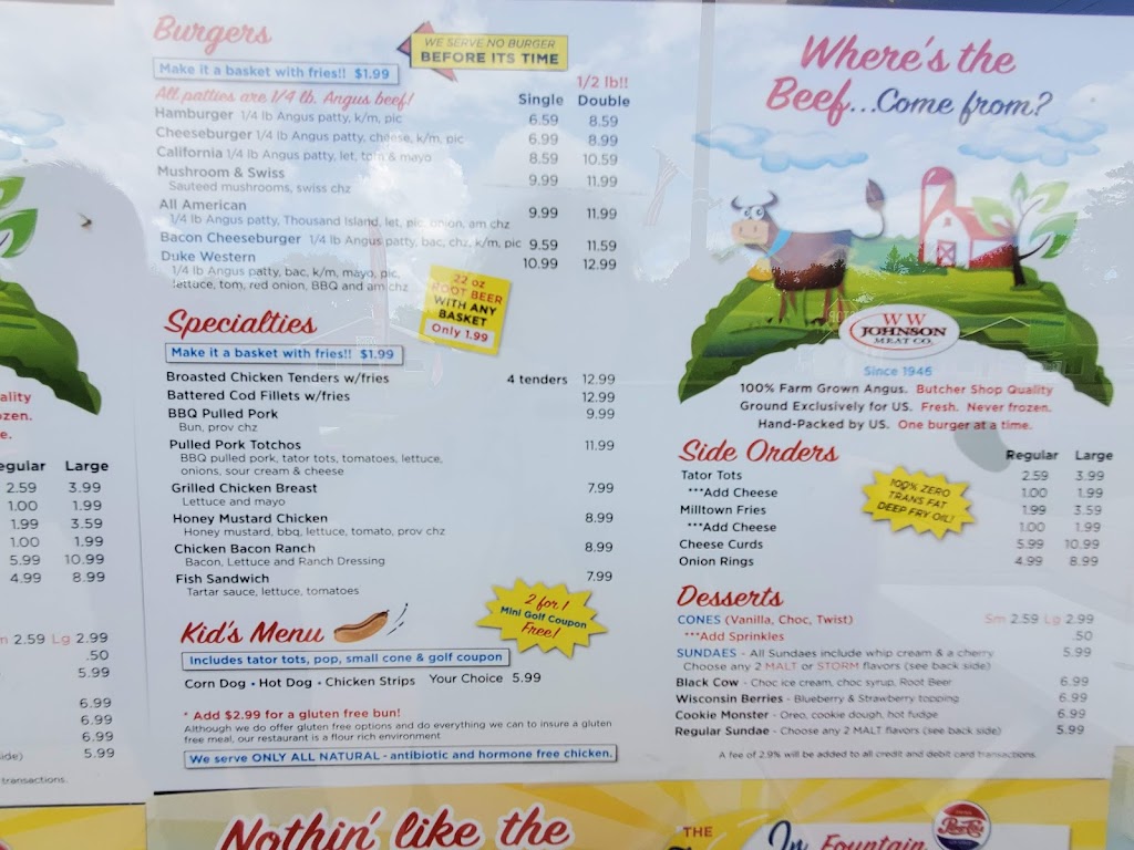 A classic Wisconsin βDairy Barβ serving delicious ice cream treats, classic twist cones, homemade root beer and great hand-packed burgers.