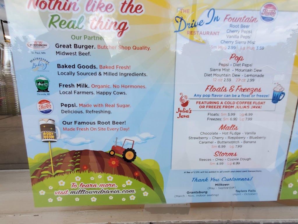 Great burgers, good (not great) fries, delicious malts and root beer. We've now been to all three locations and like the Taylor's Falls location best, but all are good.