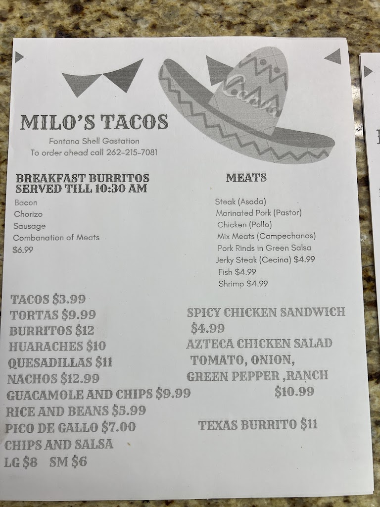 Don’t let the gas station deter you from how amazing their food is. Fish tacos, homemade guacamole and chips, breakfast burritos, etc! Great food, friendly people. Fill up your tank and grab some delicious Mexican food in Fontana, WI.