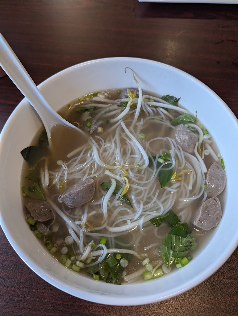 Absolutely wonderful beef meatball pho, the broth was flavorful and complex, the meat was beefy and robust, and the greens were fresh and crisp.