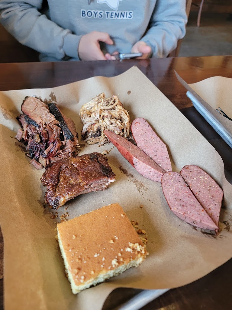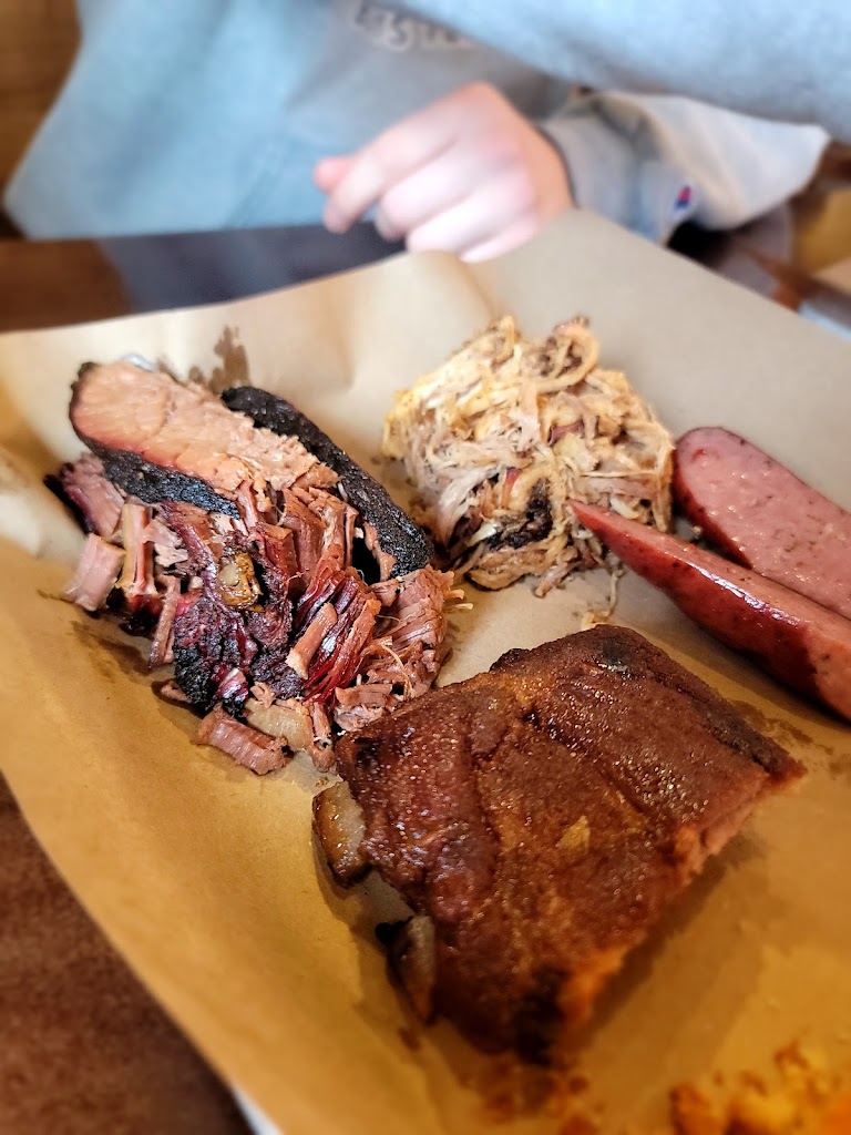 Absolutely a must for dining out! My son came in town to visit for the weekend and here’s our spread. Brisket, ribs, pulled pork, bbq shrimp, slaw, fries. Just get a sample of everything and you won’t be disappointed. Also great selection of sauces!! Pricey ?? A little….. but just treat yourself once in awhile 🥳🥳