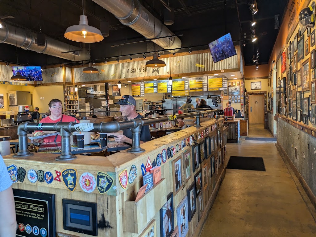 If you have not been to Mission BBQ you NEED to make it a priority asap!! This place from the moment I walked in was felt the love in the atmosphere & felt honored to have stopped in a witnessed a diamond in the rough. If you support our First Responders especially our Fallen Heroes of 911, THIS is the place to be!! Not only does the place honor our First Responders but the food is beyond delicious, each bite I took I think I died & went to heaven, from their soft & moist corn bread to their juicy & tender meat, you don't even need BBQ Sauce for it but it does add a nice touch of more flavor depending on which BBQ sauce you get. I can not rave about this place enough & we will DEFINITELY stop in each time we are in the area & support this business whole heartedly.