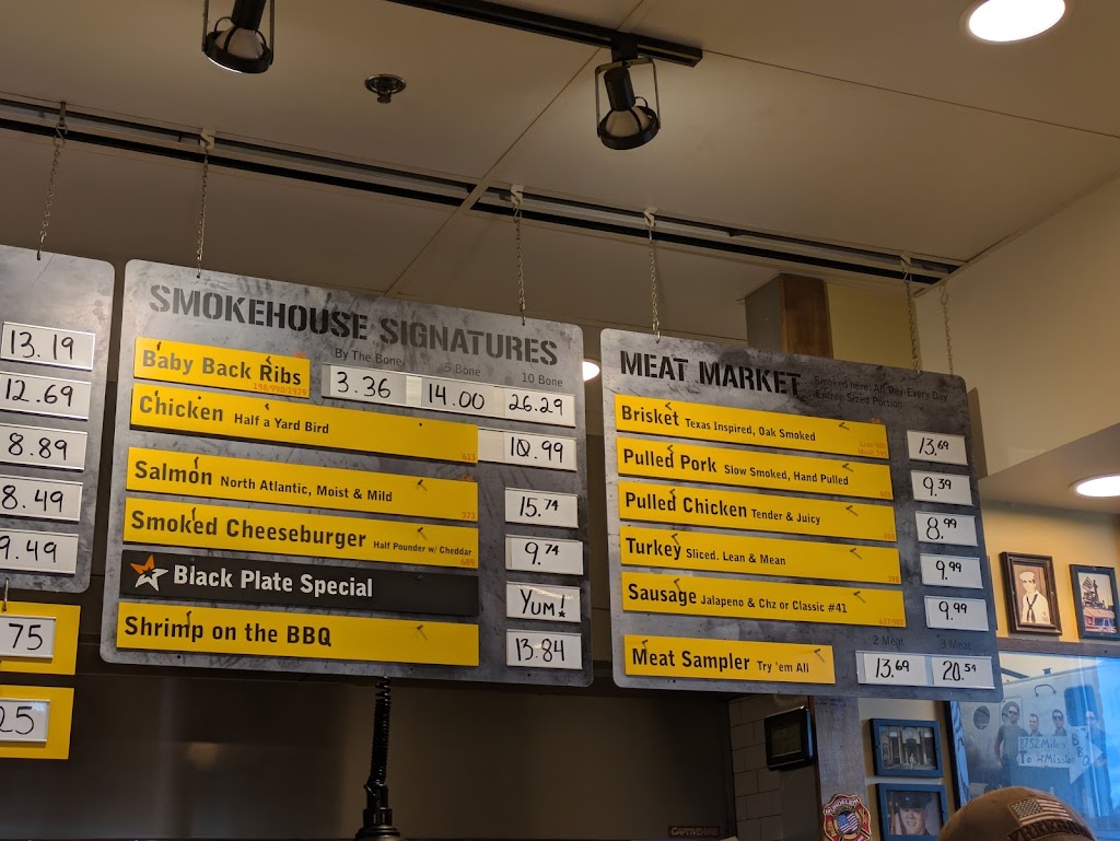 The first time I came here, I told the employee I was not sure what I should get, they gave me some recommendations and a free BBQ meal on my next visit since I was new! Every time I have been here it has been a wonderful experience. My standard meal is the meat market moist brisket and then a chicken sandwich with fries. The BBQ ribs, and pull pork are also really good. The employees are really nice, the food is consistently delicious, and the support for our military / police is amazing. When ever I need some BBQ this is the place I go. I do wish it was cheaper, but you pay for really good quality.