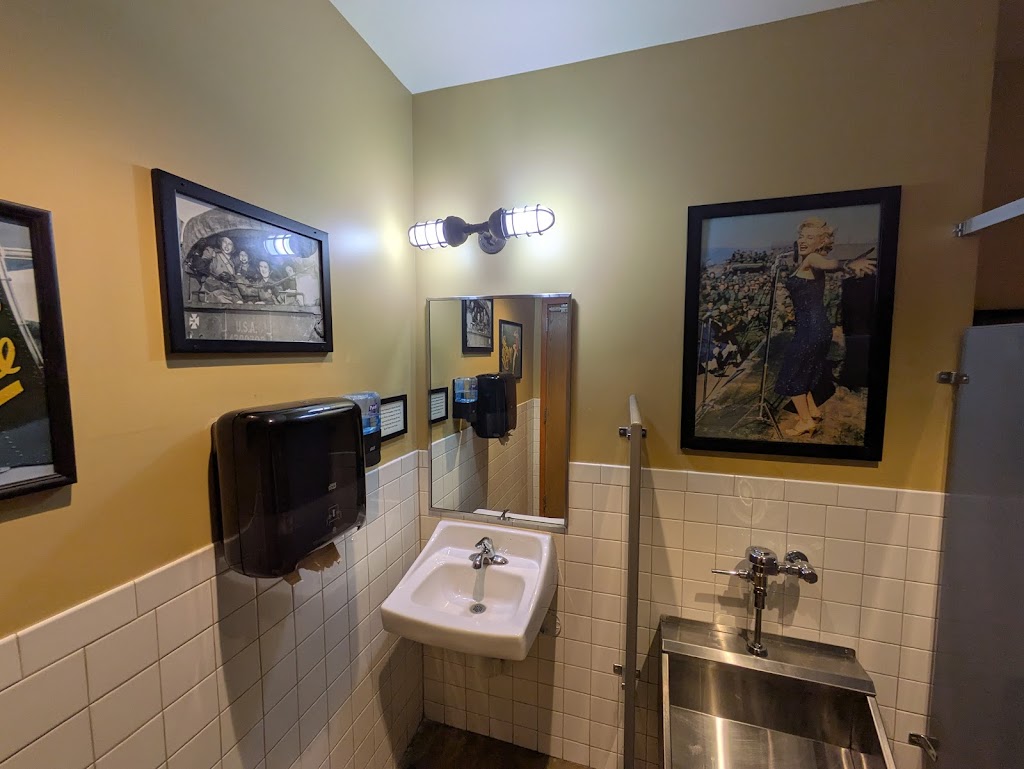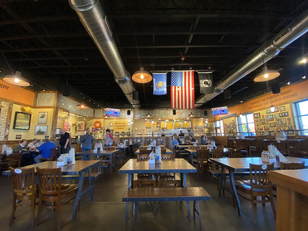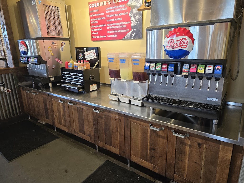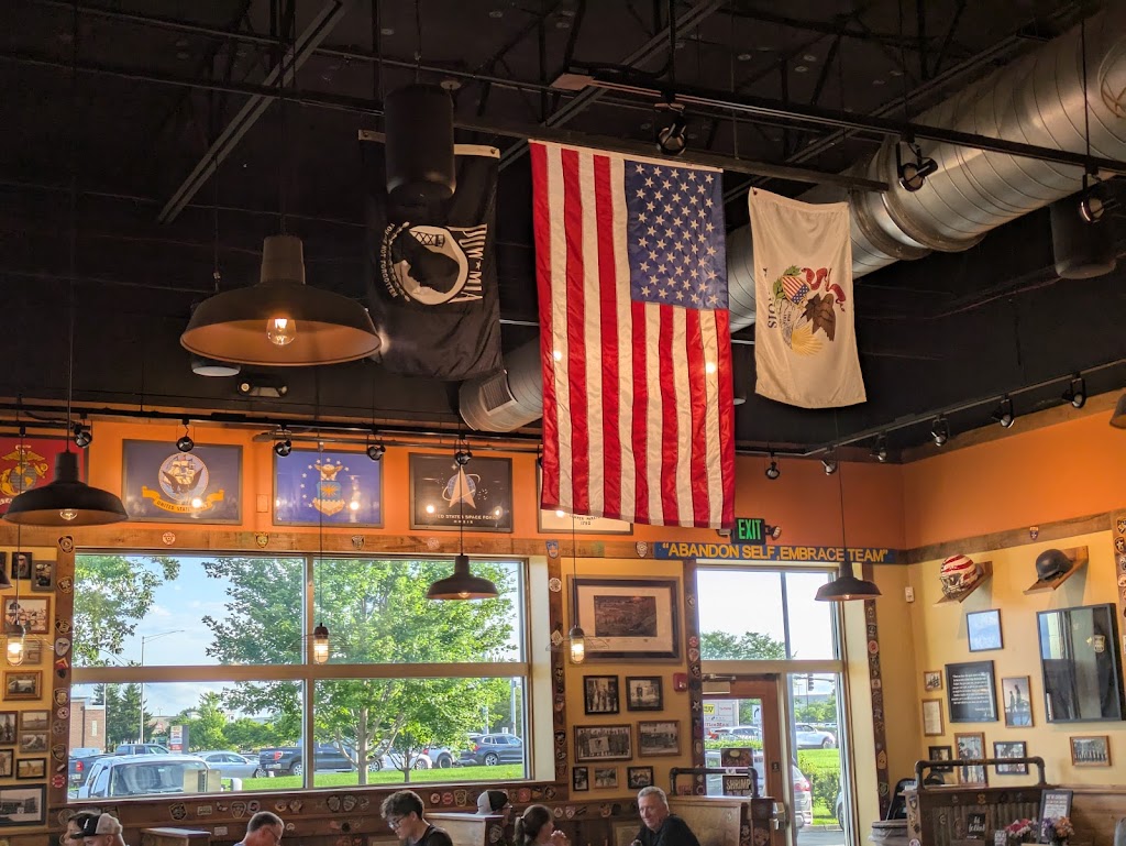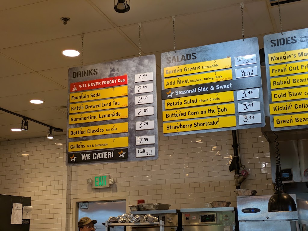 The meat was awesome. The portions were very small. We were mostly self-serve with plastic silverware and plastic cups and atreya a metal tray to eat on with a piece of Wax paper that they put the food over and there are no waiters or waitresses. It was a quick experience. There was not a whole lot to eat there but food I do have to say was good though but very pricey for small portion. It was nice atmosphere, quiet patriotic lots of stuff on the walls to look at. Very entertaining