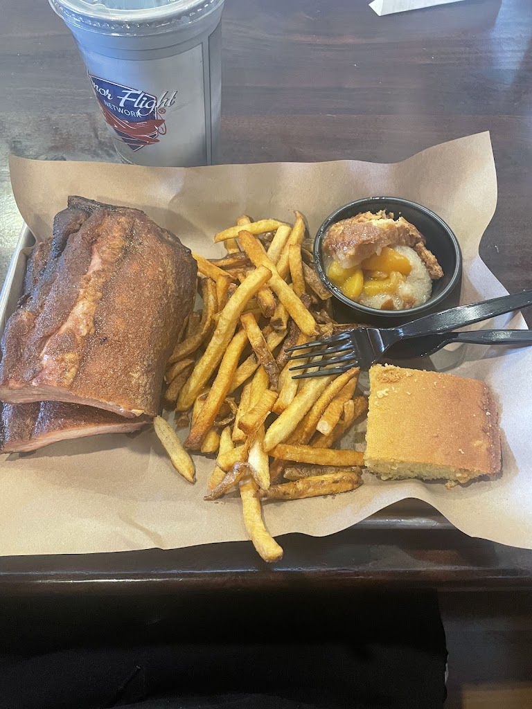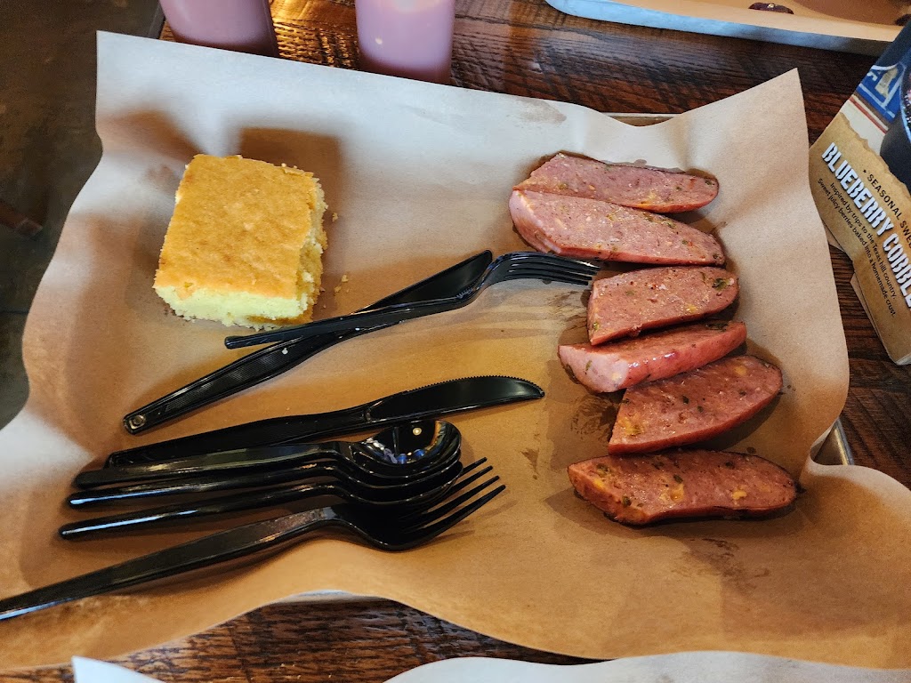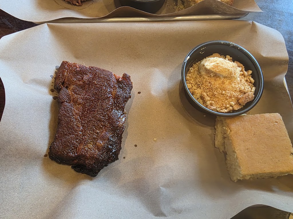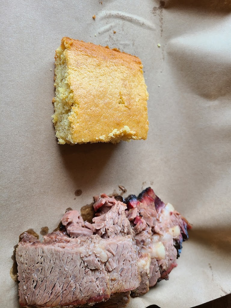 Some of the best darn BBQ I've ever had!! I barely eat and was a carnivore heaven monster while scarfing down tender brisket, pulled pork, and OMG a must try is the jalapeño cheese sausage. Hardly no heat yet bursting with flavor! That meat was literally the best I've ever had. It's hard not to find one that's not dry on one or more meats...nothing was dry or soaked...just plain simply scrumptious! Cudos to the chef/chefs for darn sure! Cornbread was delish as well! As sauce suggestion I got the Smokey Mountain (sweet and smokey) and KC original (no bite but has spice) and mix em!!!! Parfectooooo