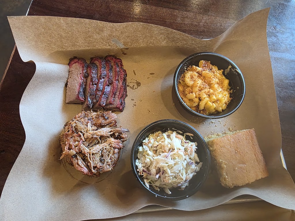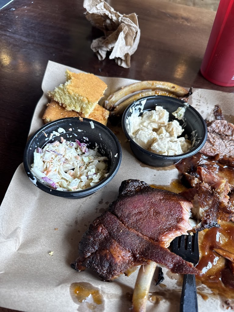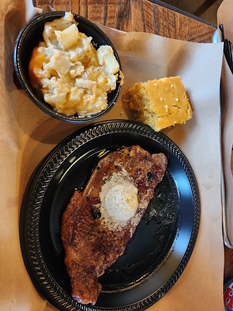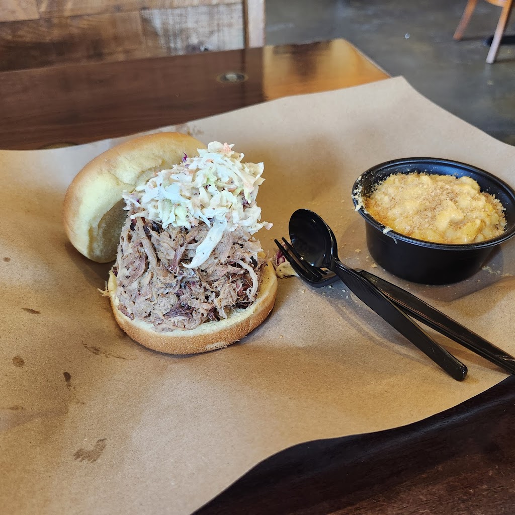 1st off im a BBQ snob. I was greeted by a very friendly young man who after I said I had never been there came around from behind the counter and explained the menu. I ordered brisket, pulled pork and 3 ribs. Sides were COLD slaw and Mac and cheese. The good. Ribs were 🔥!! On point fall off the bone. If you want competition ribs look elsewhere. Mac and cheese was really good . All meats seemed to be sauce less and you add your own after. THANKS FOR THAT. Let the meat flavor stand on its own. The bad[if you can call it that] personal preference. Pulled pork was very stringy. I prefer a bigger chunky style pulled pork. It was tasty still tasty. COLD slaw...eh. I prefer a more apple cider taste but was OK. Corn bread...I prefer a more honey flavor profile but was good average cornbread. The banana pudding was a nice finish. Overall 8/10 will definitely be going back next time in town. Thanks for honoring those who are/have served!!!