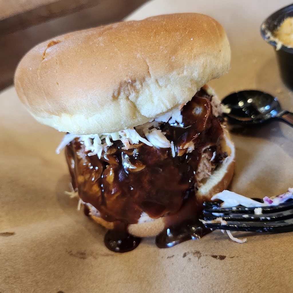 I always get pulled pork sandwich traditional with two sides , Potato salad and mac and cheese and a drink.