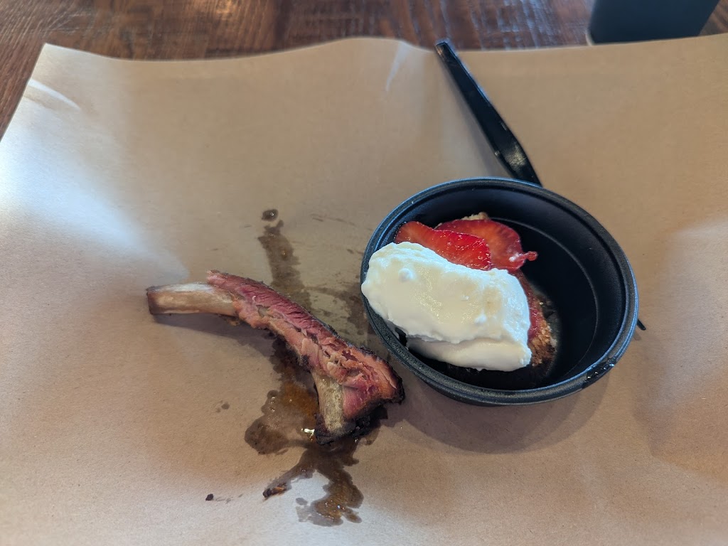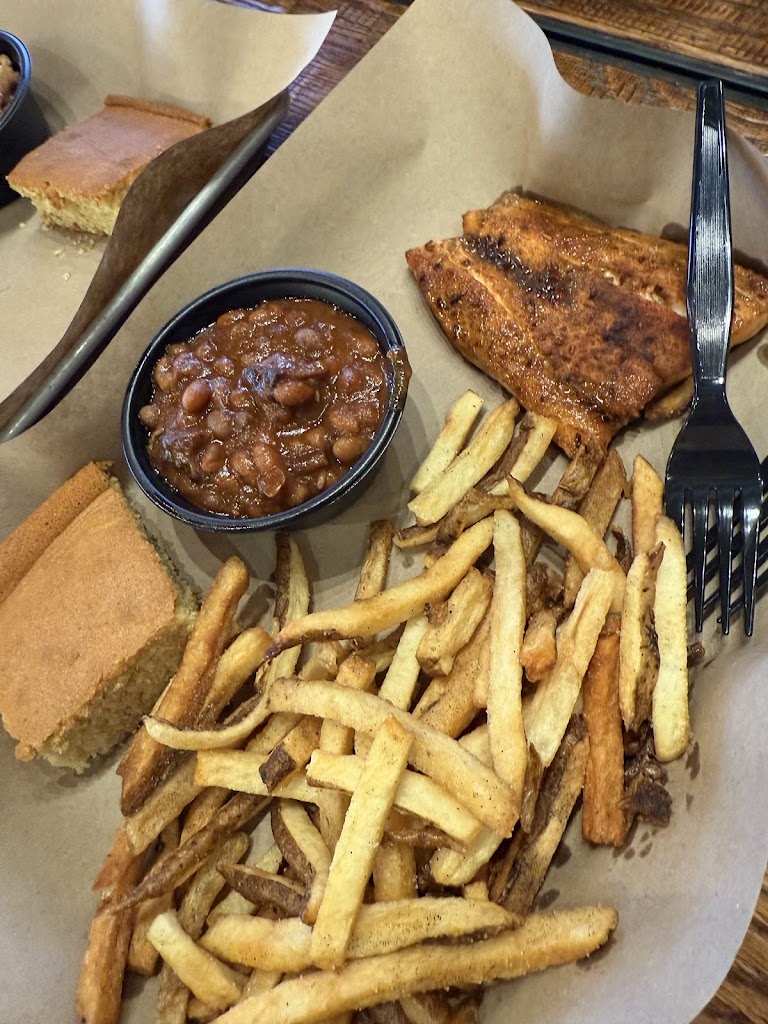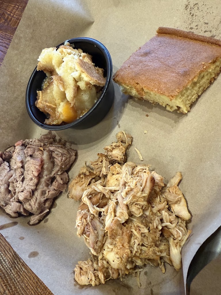 The food was amazing — the meat was tender with the perfect smoky flavor, and the mac and cheese was creamy and delicious. Each entree comes with a piece of cornbread, and it was so good.