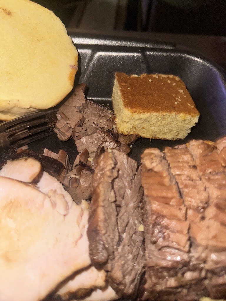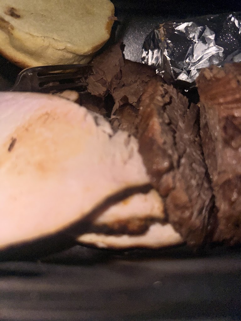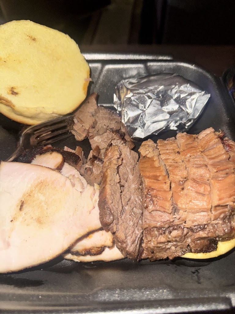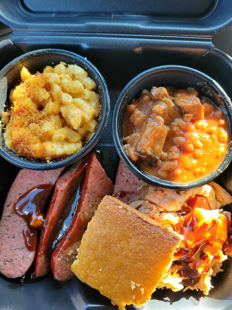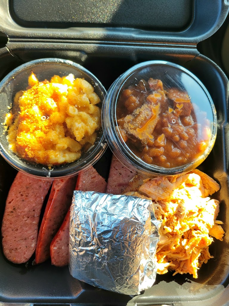 Chunks of brisket were hidden in the sweet baked beans. Served with a cheesy, buttery, piping hot macaroni and cheese with tender chicken drenched in that sweet bbq sauce and smoky sausages with a nice snap.