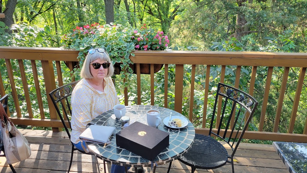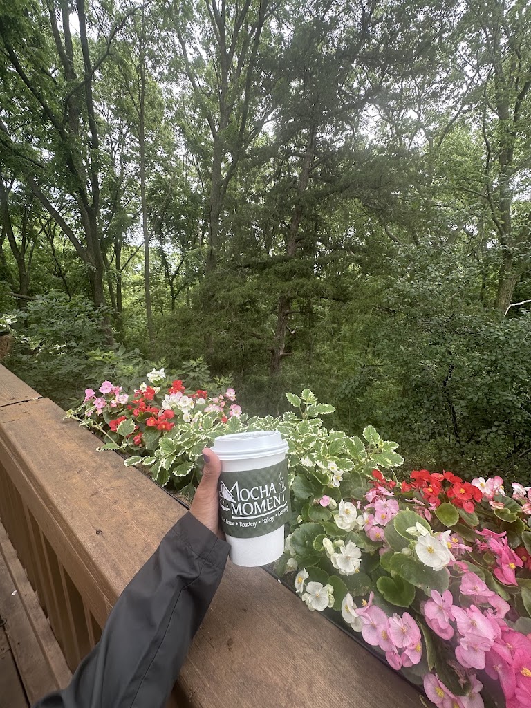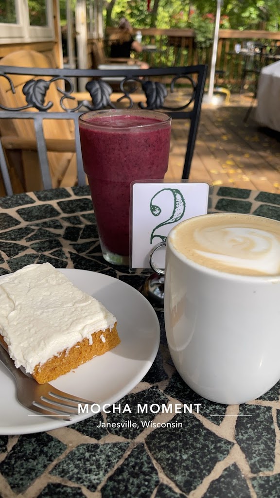 Was in Janesville for a memorial and got in early, so googled open restaurant. The name Mocha Moments called to me. The place was super cute and well-liked by locals. The atmosphere was charming, though it could have used a bit more light. The outdoor deck overlooking the woods made it feel like we were in a tree house. I had a scone, which was house-made and delicious, as well as an iced caramel latte. I'm glad we stopped in!