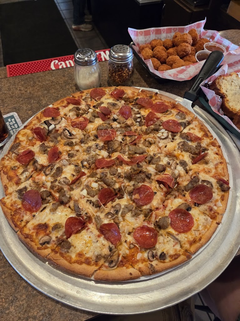 Pizza was very good. Boneless wings were too. Beer was cold.