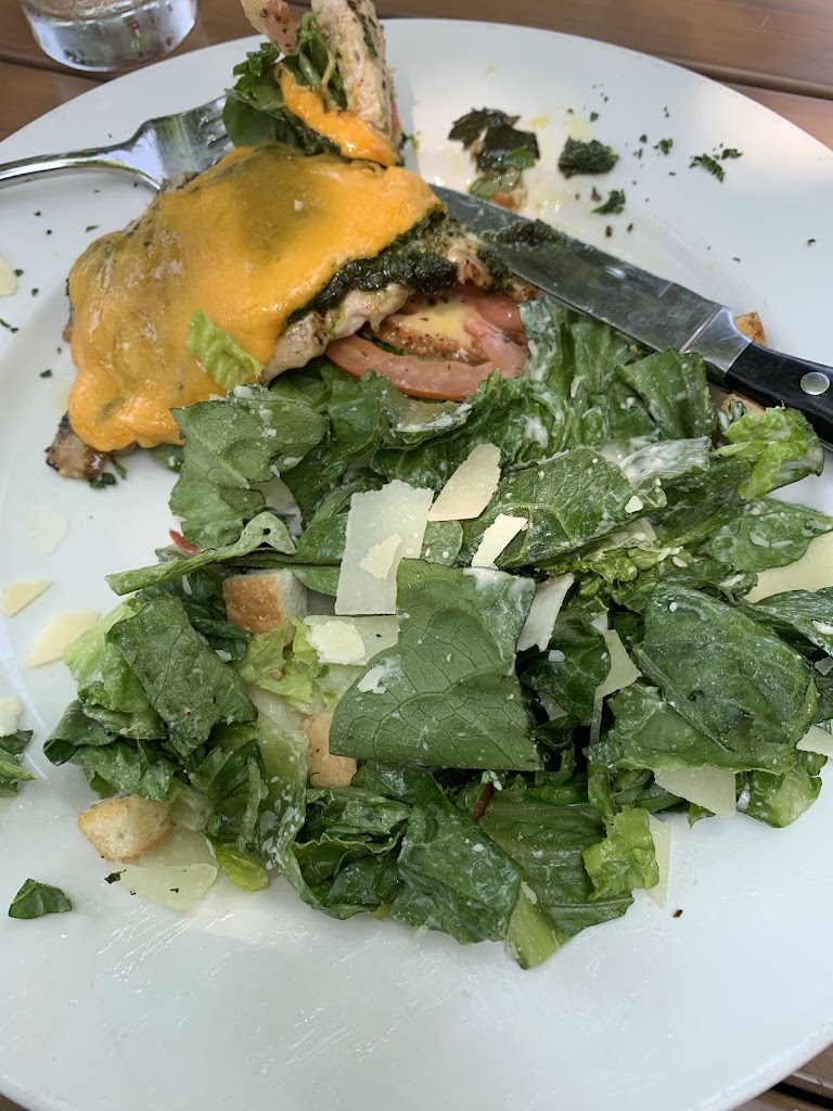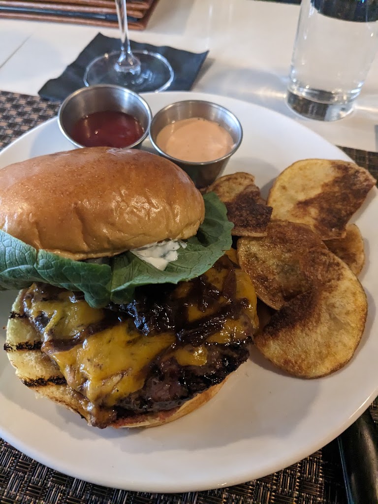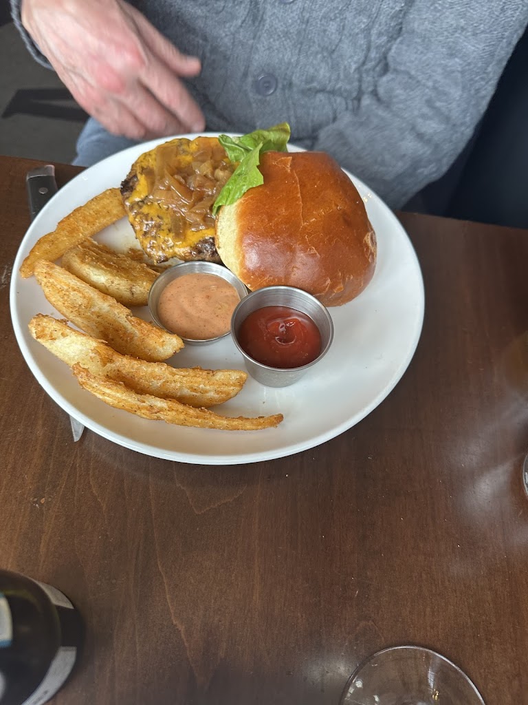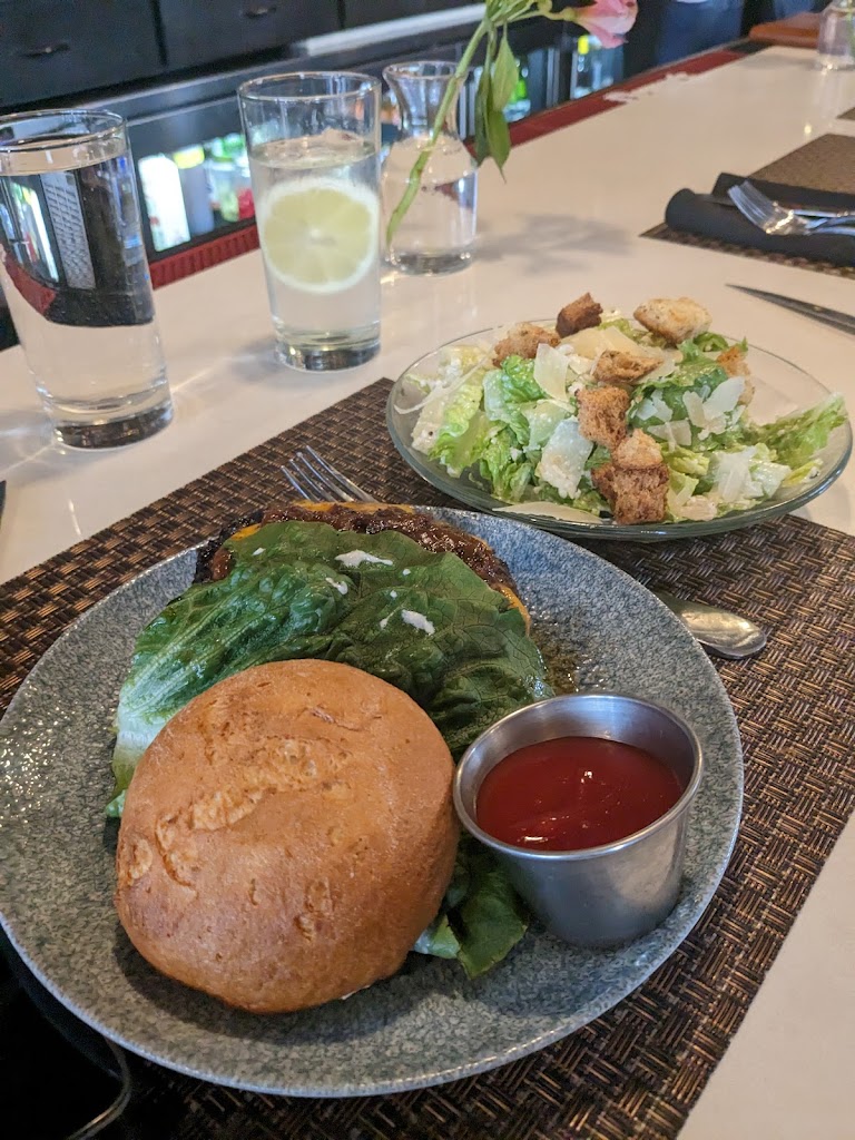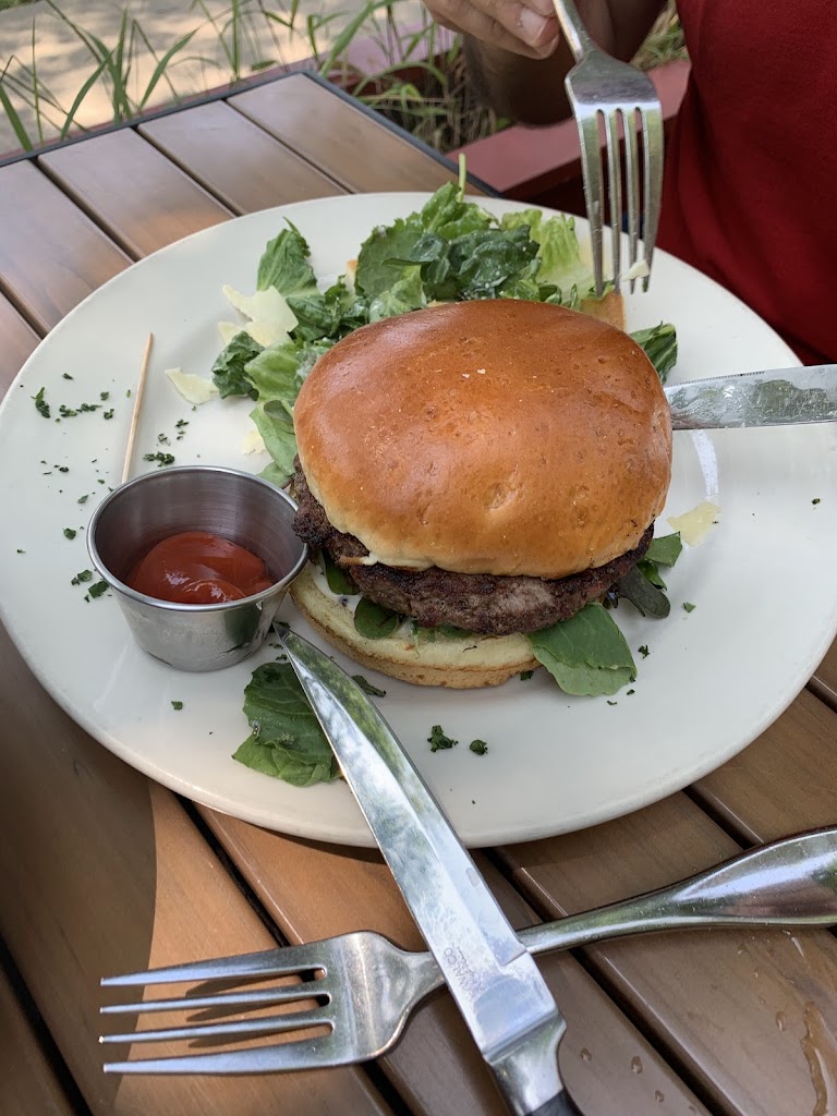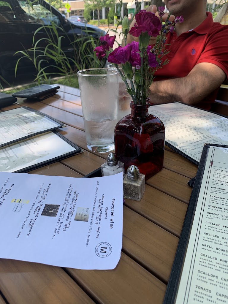 We ate outside on the patio. It was delightful. Service was fantastic and table setup was beautiful. Felt lux, butttt not over the top. Dogs welcome on the patio! Husband had a delicious burger, I had pasta carbonara and Mom had classic casaer with chicken. Everything was delightful! Recommend this location. Will go back!
